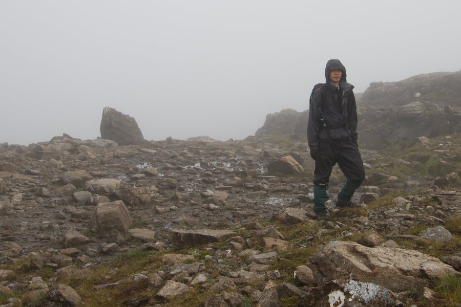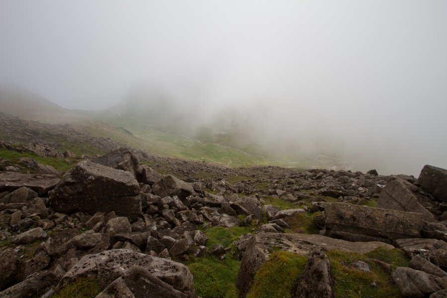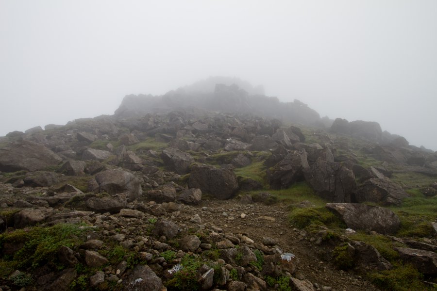 Day 3 had started out dry, just as the weather man had predicted. time to get into the mountains. We followed the path past the back of the castle and up to coire dubh. Instead of continuing forward up onto the bealach, we cut left and followed the clear track onto cnapan breaca. we climbed the rocky slope ahead of us for a direct route onto the hallival ridge. It was clear that my previous research into the area was correct. Paths are faint if at all visible. a lot of the time it's a case of finding your own route to the summits. from the ridge we had a short scramble up to the summit of hallival. Unfortunately we were amongst the clouds with very little to see.