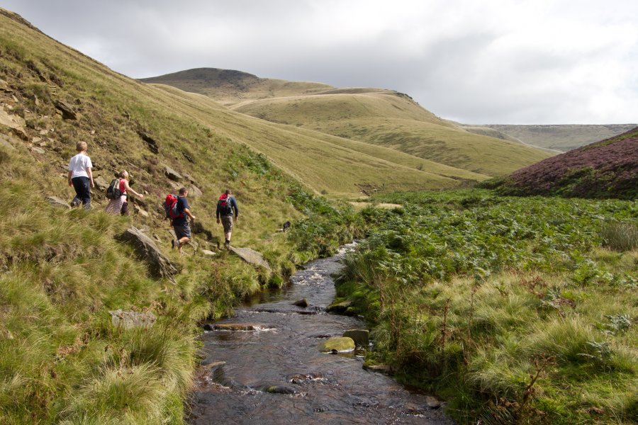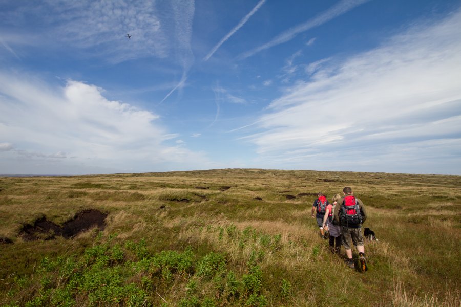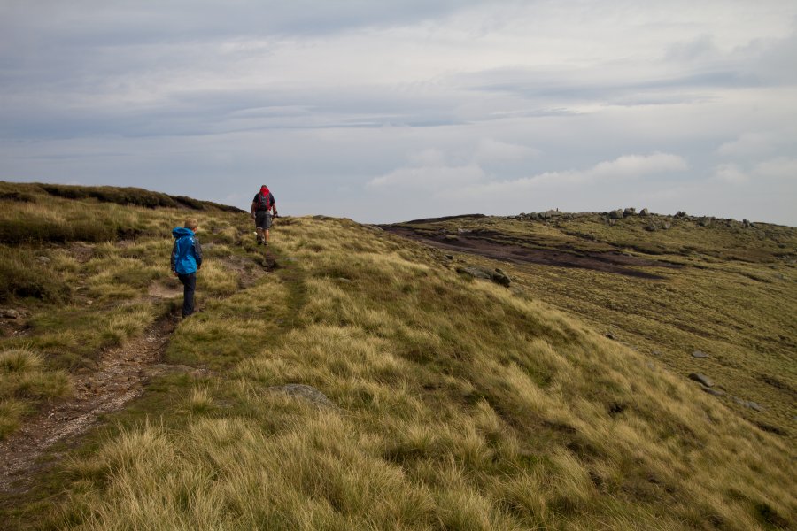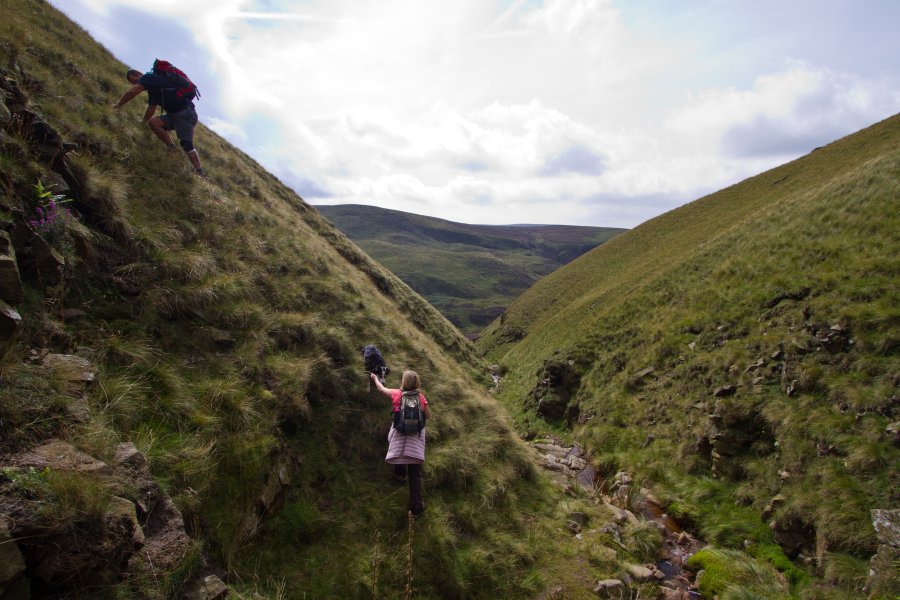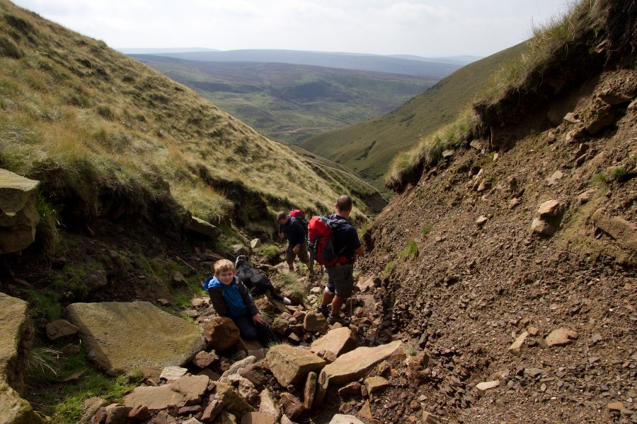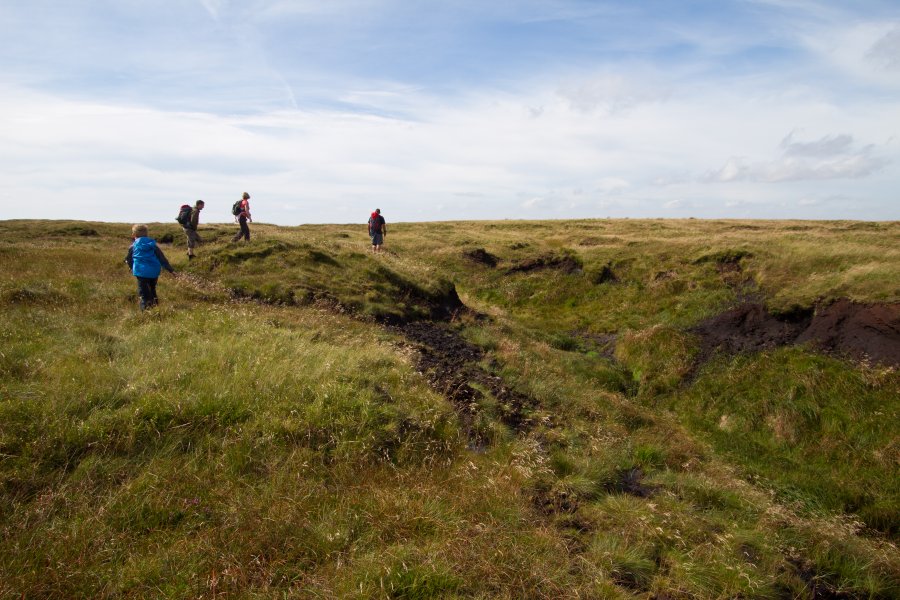 negotiating the bleaklow peat groughs. now a lot greener since the re seeding began
