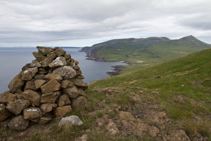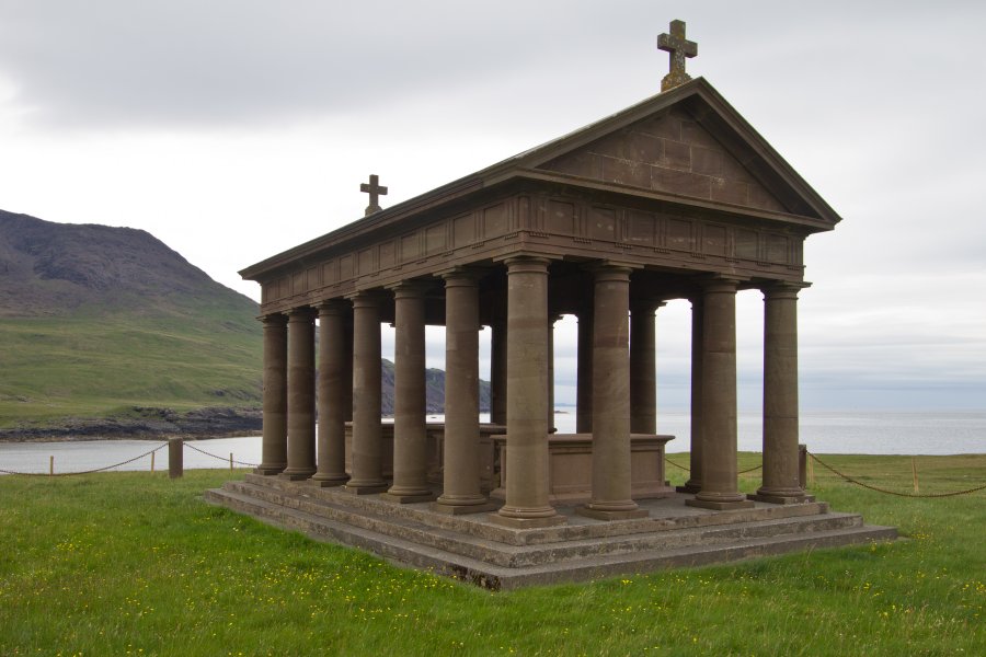 finally we swung around the base of ruinsival and saw harris bay in the distance. we were now welcomed with a well warn path to follow down to the bay. the main feature of the bay is the mausoleum of sir George bullough, his wife and son. a bit strange having this grecian style structure in the scottish wilds but kind of makes it more striking with the backdrop of the sea.