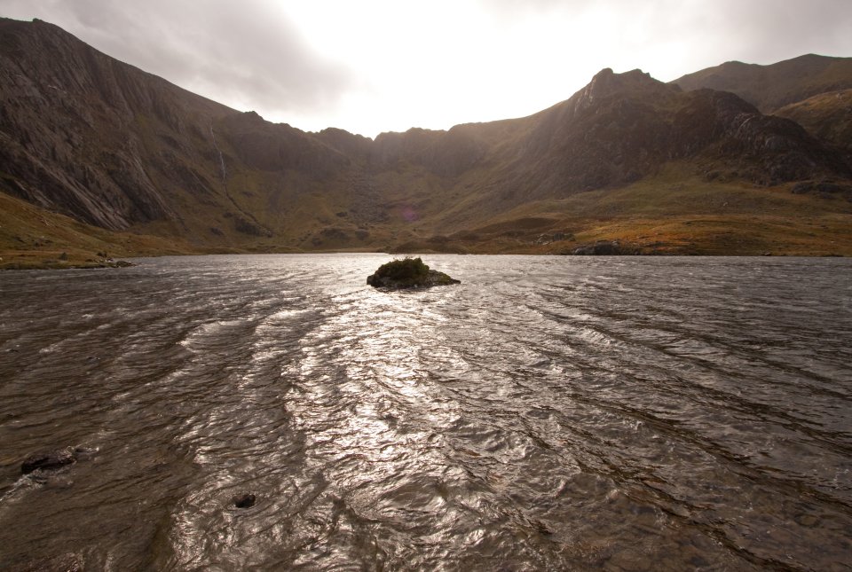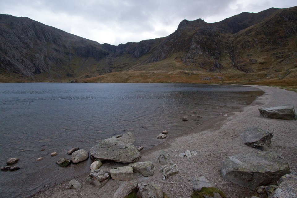 Llyn Idwal. Devil's Kitchen is located at the rock slope (back middle)