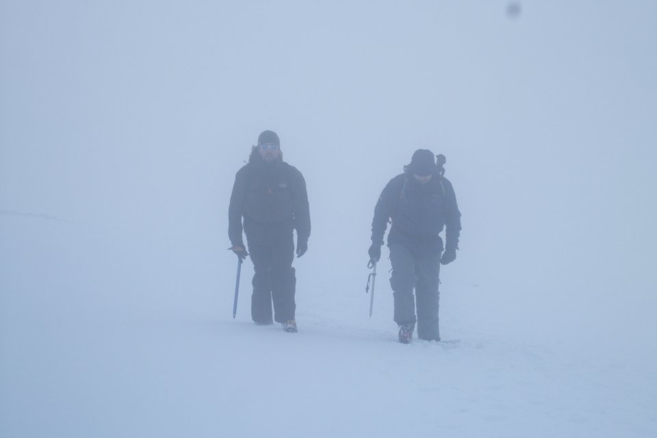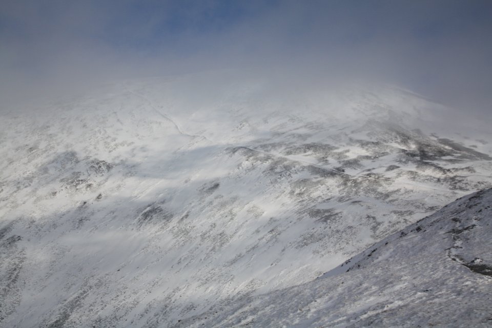Zooming in on the track that would lead up to the summit. Clouds closing in.