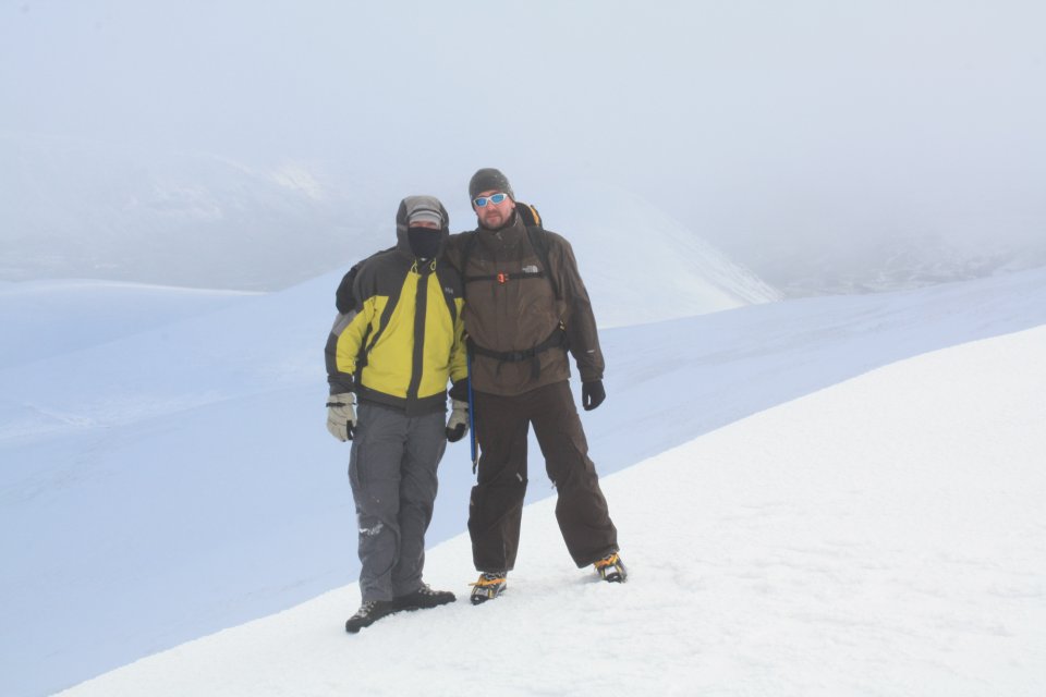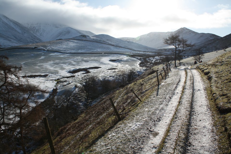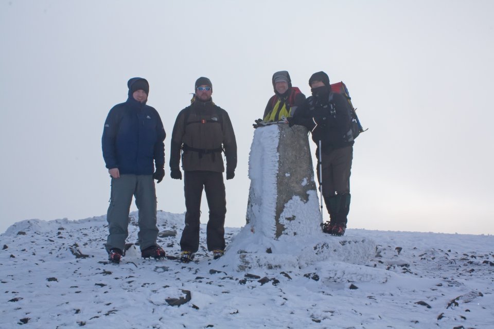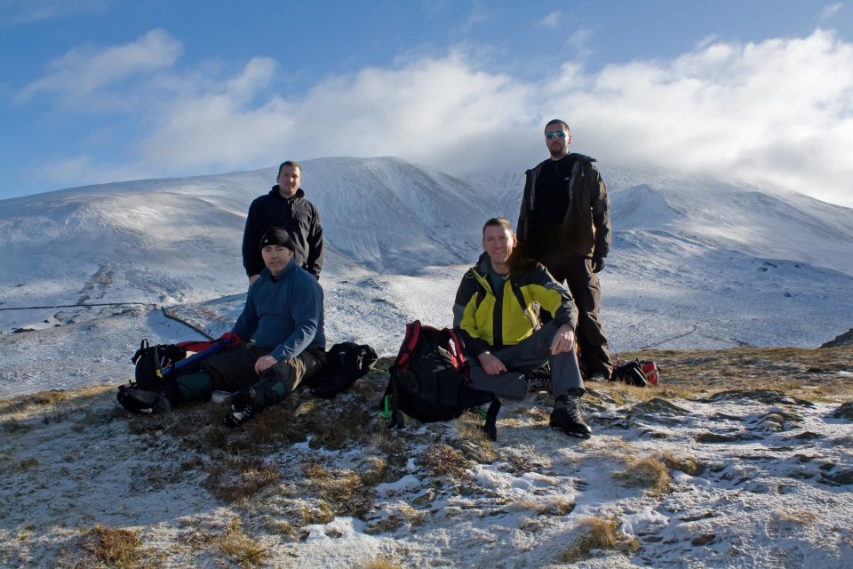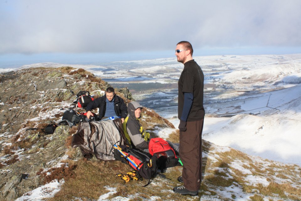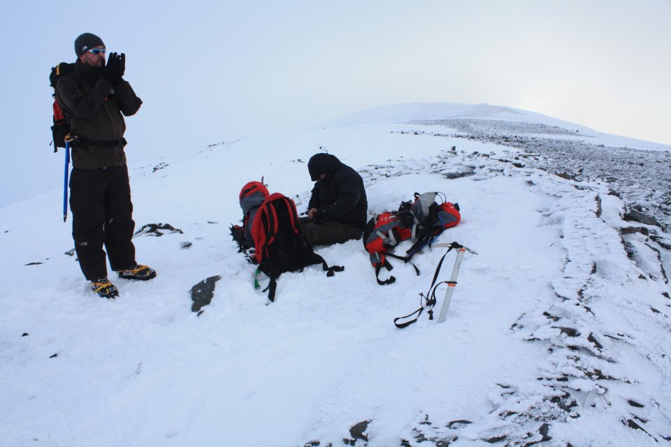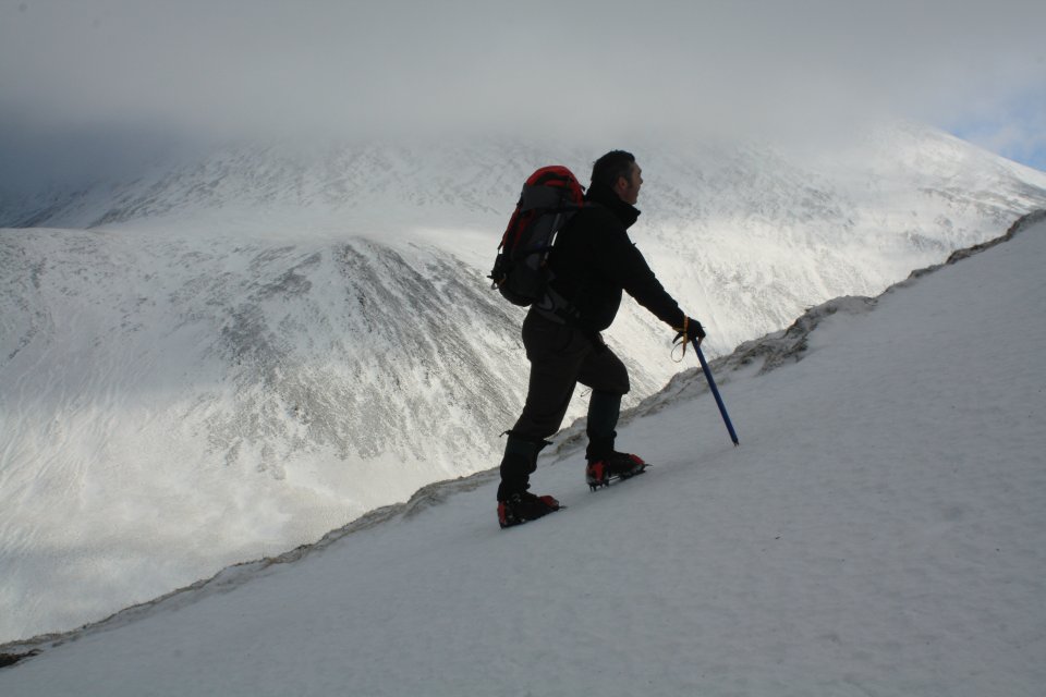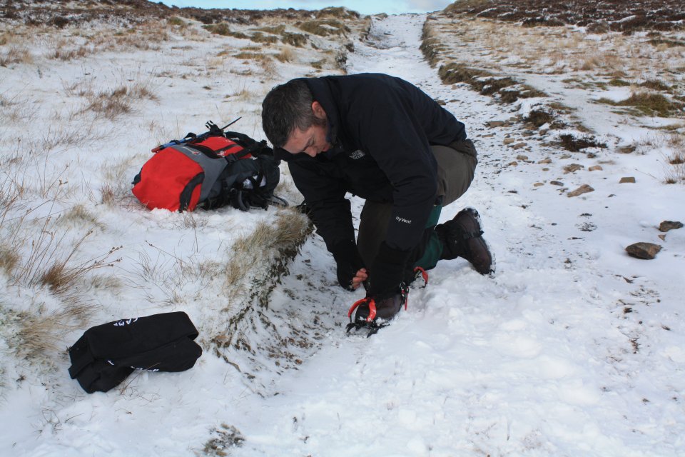 Geordie putting on crampons for the ascent of a frozen Ullock Pike