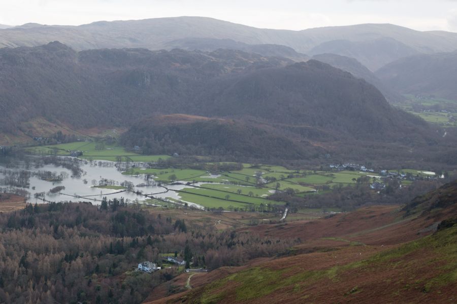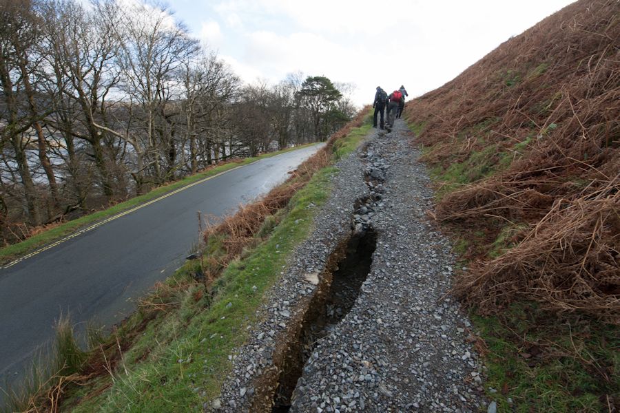 Our final plan before giving up was to head back towards Keswick and see if we could do a quick summit of Catbells. We really didn't have time for much else. Fortunately the Keswick roads were passable and we got to the foot of Catbells without too much difficulty. By now the sun was out and although rather cold, the conditions for walking were very good. Ascending into the hills the surrounding views revealed the extent of the flooding around Keswick and on the hill itself. Deep cracks in the footpaths leading up Catbells caused by the huge volumes of water looked rather threatening, like the side of the slopes could break away. that might be a slight exaggeration but take a look at the photos and you will see what i mean. Further erosion was visible on the descent and one of the ghylls above Brackenburn had clearly become troublesome to the properties below. In terms of a trip away it turned out to actually be a memorable experience, a battle to remain positive which surprisingly ended with a decent walk. Fortunately we weren't near or couldn't reach the worst hit places and it wasn't until we got home and saw the footage on the news that we really realised what people were going through.