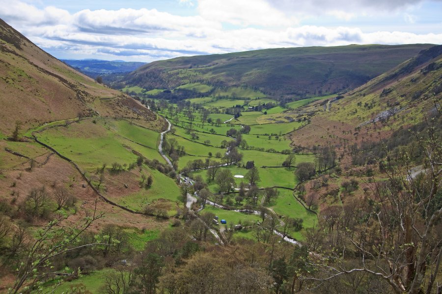 Looking out from Craig y Llyn down to Llyn Lluncaws