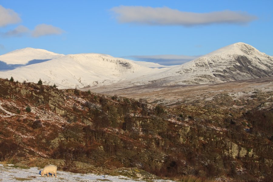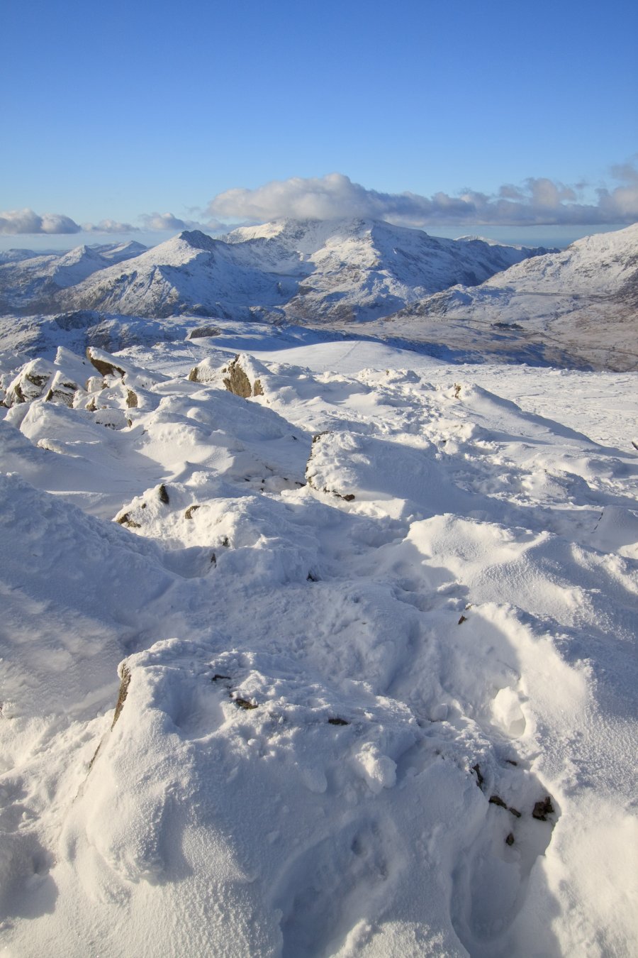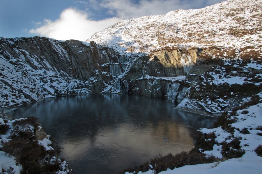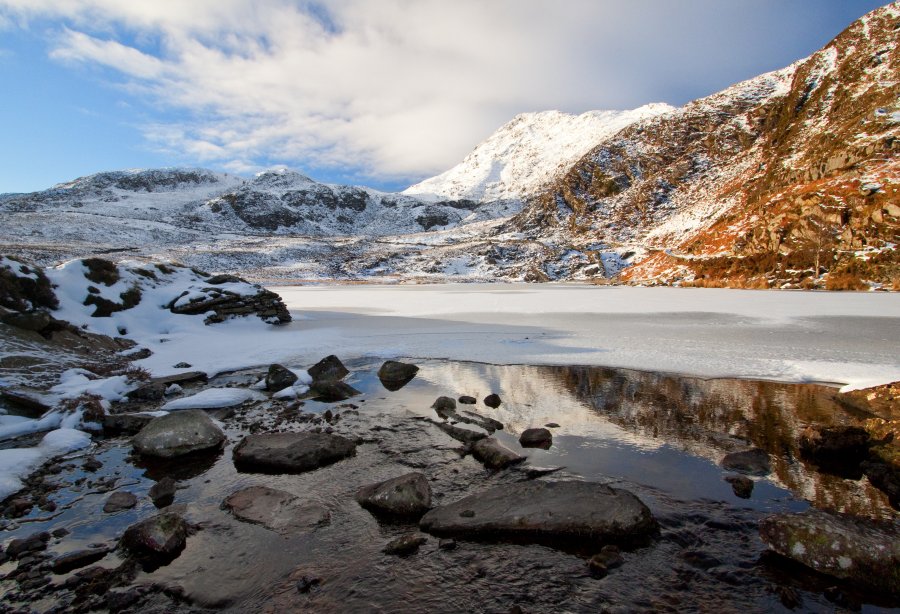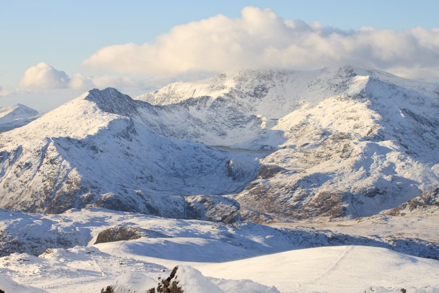 The Daear Ddu ridge in full view and a completely frozen Llyn y Foel to the left