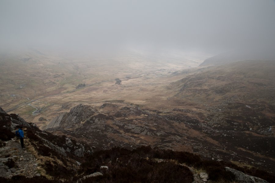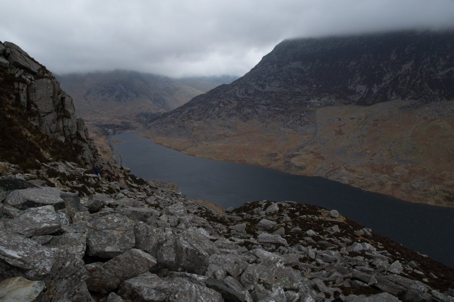 LOOPING BACK ROUND FROM THE HEATHER TERRACE AND WE ARE NEAR THE START POINT OF THE NORTH RIDGE. LLYN OGWEN IN THE DISTANCE