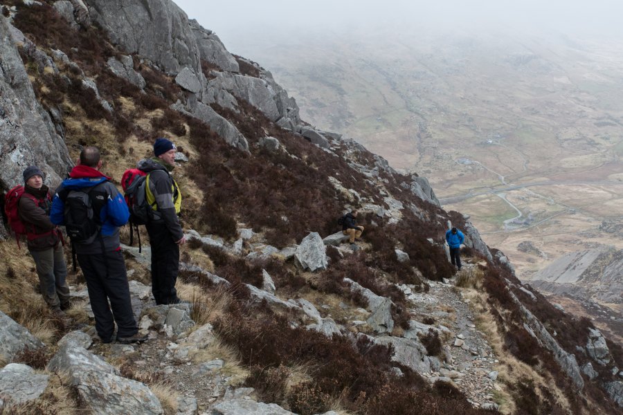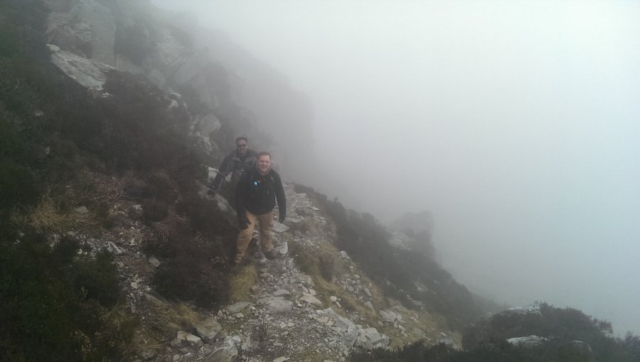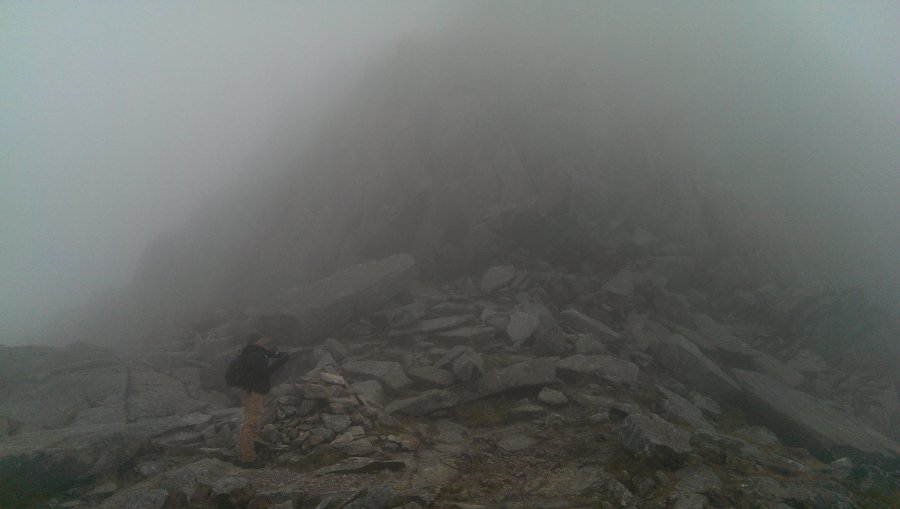 as part of my stag do we decided to do the north ridge of tryfan. several of the guys hadn't done it before and didn't know what to expect either. pretty much from the start i had to pack away my nice camera and resort to the camera phone as the weather was pretty grim. there wasn't a great deal to see either as the cloud was pretty much down to the base. WE SPLIT INTO TWO GROUPS OF 4. IT SEEMED LIKE A GOOD IDEA ON THIS SORT OF CLIMB AS THERE WOULD HAVE BEEN A FAIR BIT OF WAITING AROUND OTHERWISE. WE CHOSE TO DESCEND VIA THE HEATHER TERRACE AND BACK ROUND TO THE FOOT OF THE NORTH RIDGE. IT SEEMS THAT EACH TIME I GO UP THE NORTH RIDGE, I SEEM TO TACKLE IT SLIGHTLY DIFFERENTLY. THAT'S WHAT MAKES IT SUCH A GOOD ROUTE.