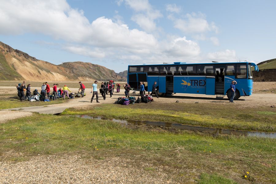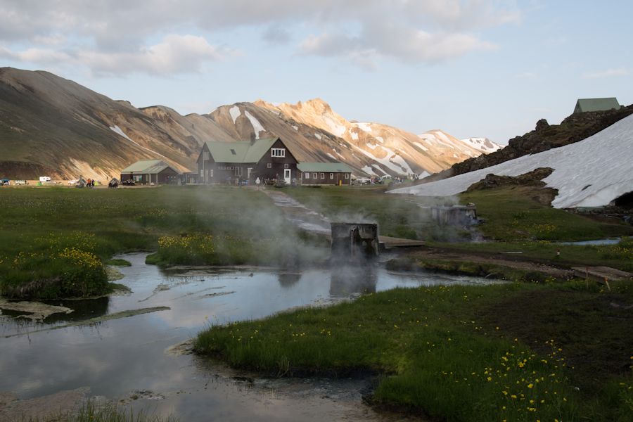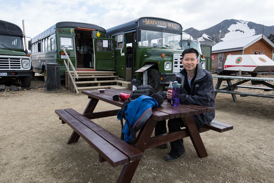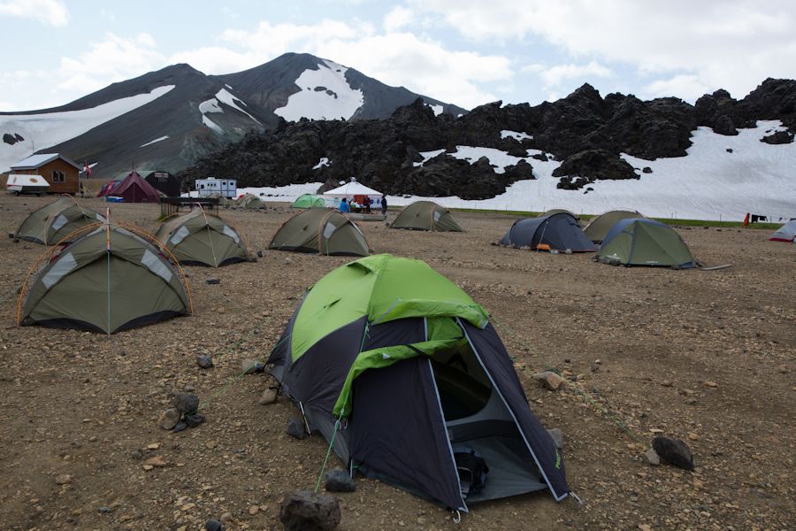 After a late night arrival to Reykjavik we woke early and set off on the bus to landmannalaugar. 4 hours of humps, bumps and river crossings later and we arrived in glorious sunshine. first job was to set up the tent and it wasn't easy. The camp ground is very rocky and this made driving in tent pegs particularly difficult. fortunately though the site wardens have boxes of large rocks laid out around the site to help secure the tents.