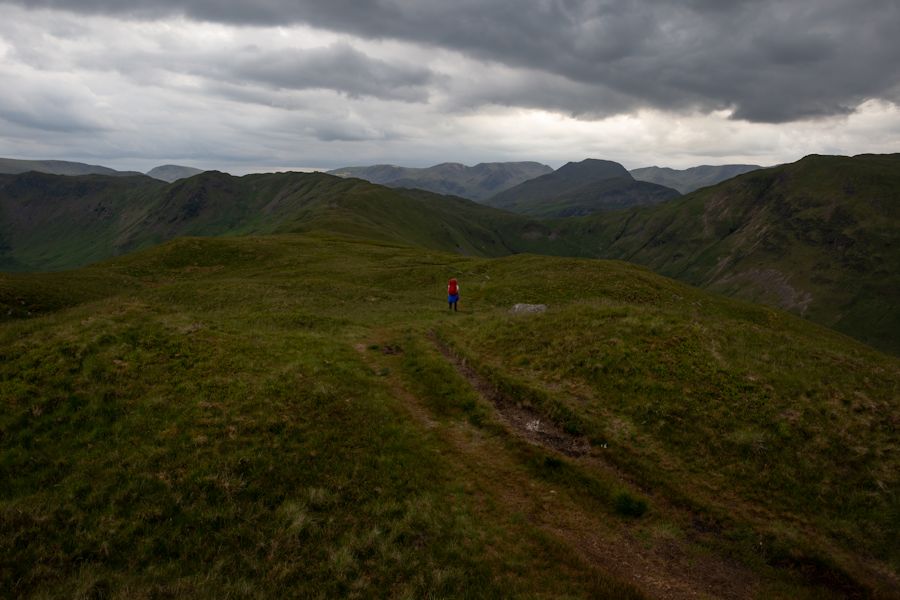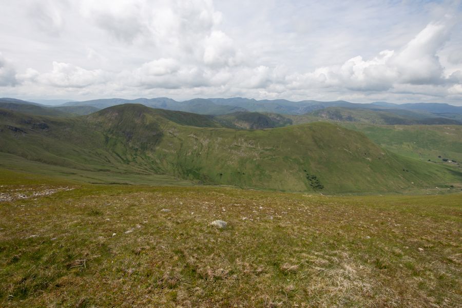 looking down from the knott. helvellyn range in the distance and catstycam just below the cloud line