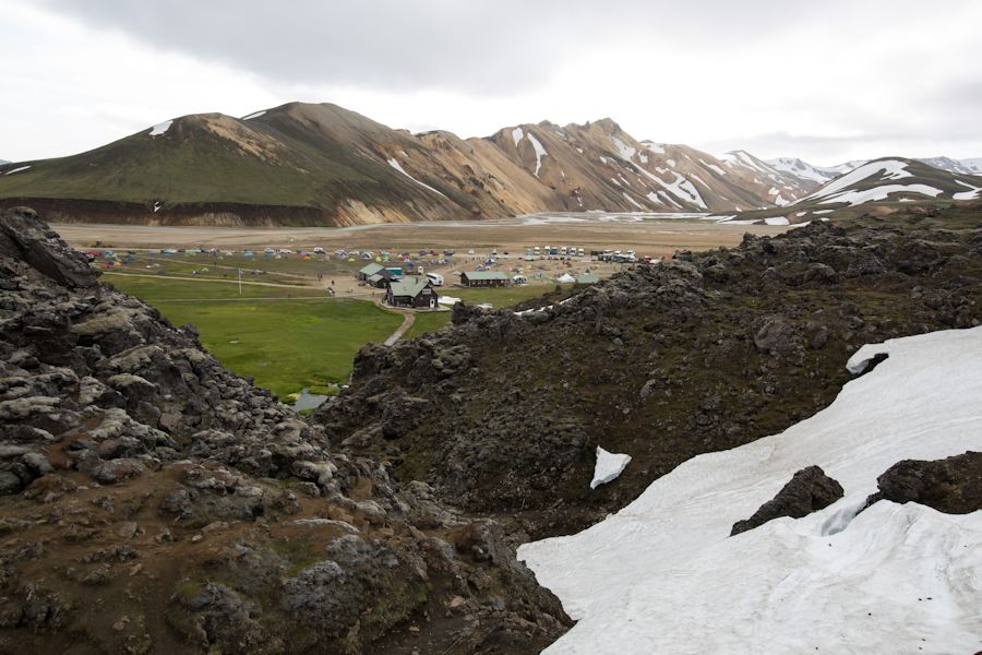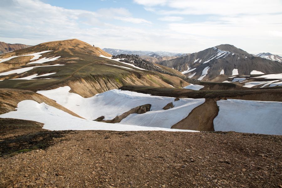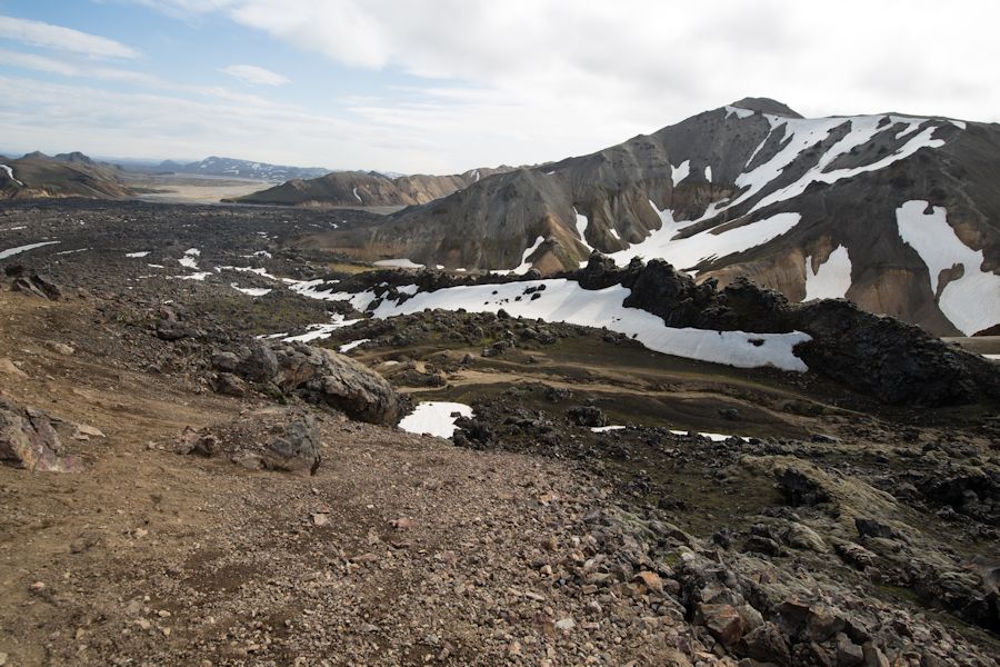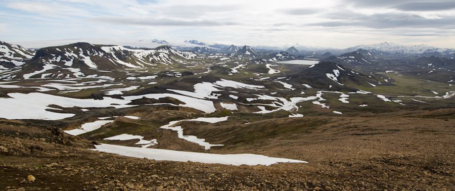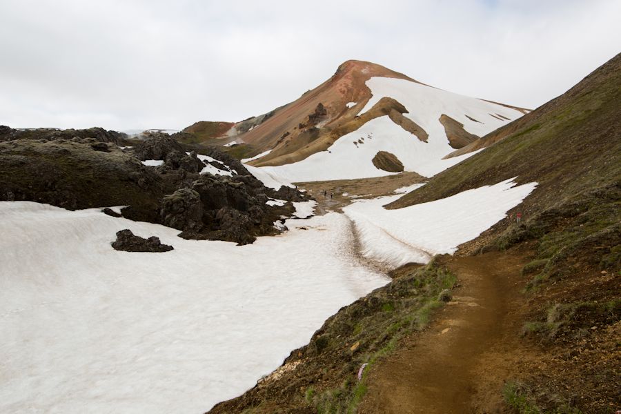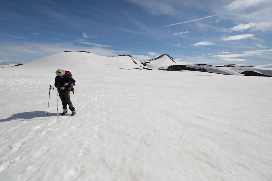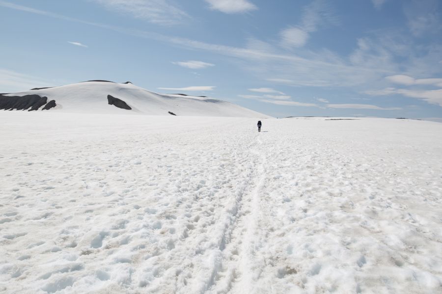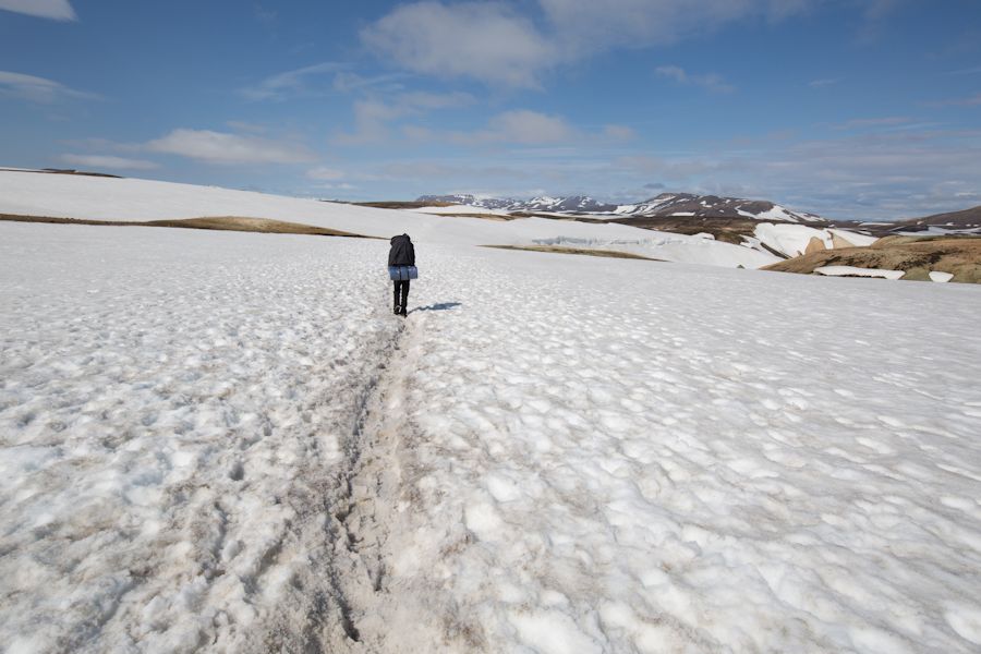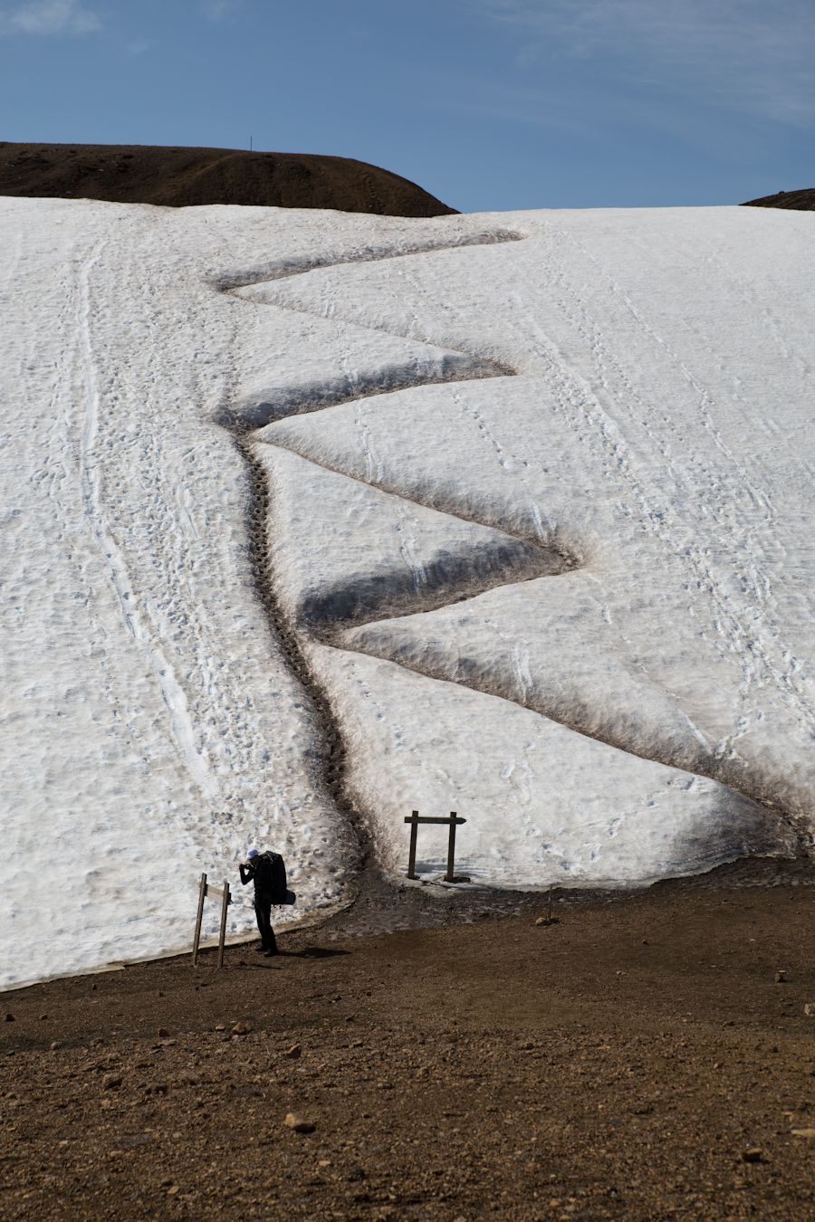 The day of the Laugavegur had finally arrived. I leant about this trail several years ago after my previous visit to Iceland. Photos I had seen online revealed an alien landscape packed with dramatic peaks, glaciers and lava flows. I knew that if it was even half as good as yesterday's climb up Blahnukur then we wouldn't be disappointed. Today was also the start of the laugavegur marathon so the camp as very busy! I believe the winning runner completed the route in under 5 hours!! The recommended time spent on the Laugevegur is 5 days to make the most of the scenery. our plan was to complete it in 3 days and then extend our journey by an extra day and complete the Fimmvörðuháls Pass too. We chose to wait for all the runners to leave camp before we set up. At 09:15 the last group of runners set off and so did we. the runners were gone and trail was quiet again. one thing we were warned about before we set off was that the trail had an unusual amount of snow still on it for july. This meant a tougher and slower day but really you couldn't complain about this walk taking too long.