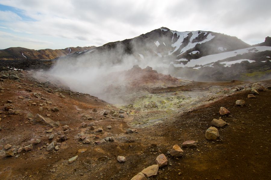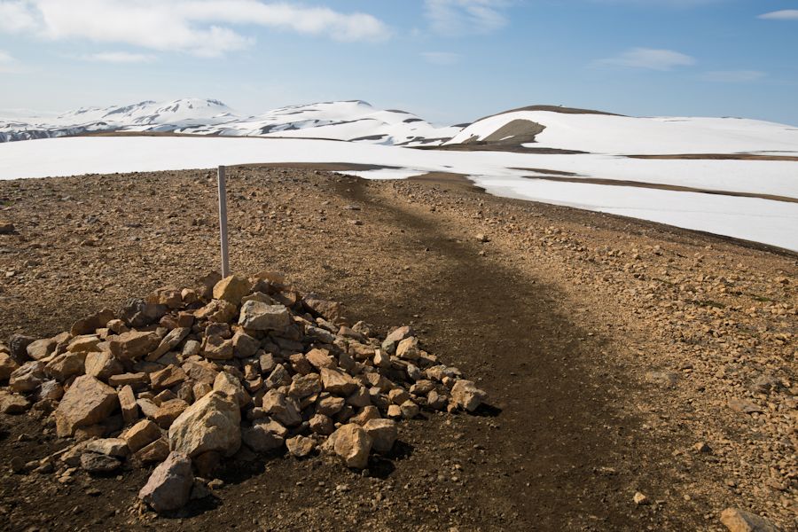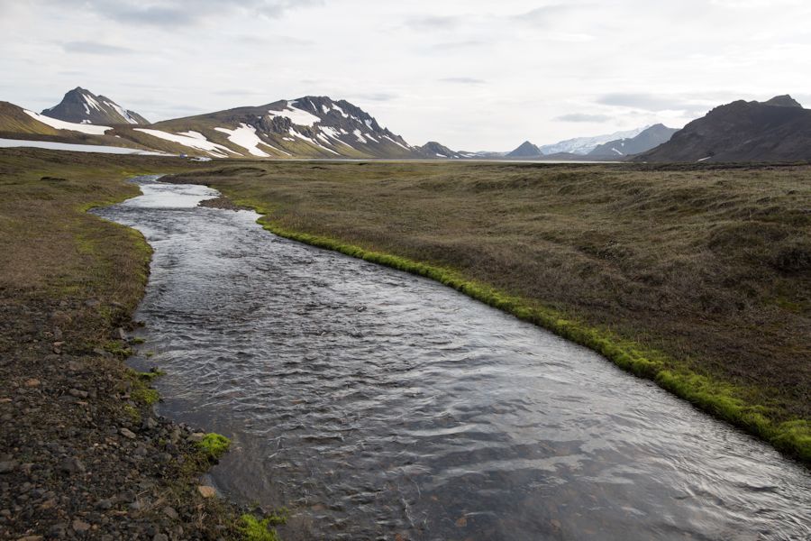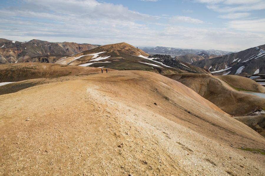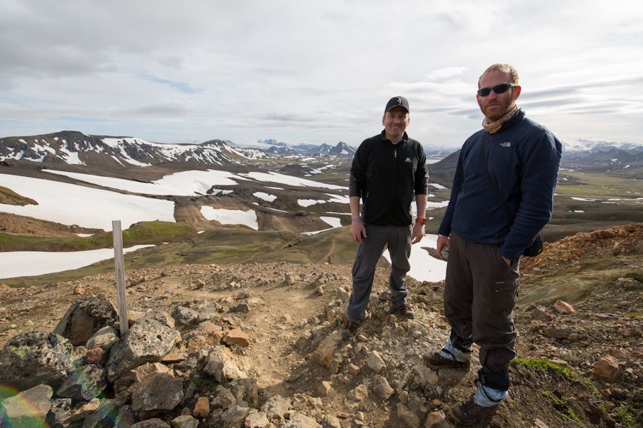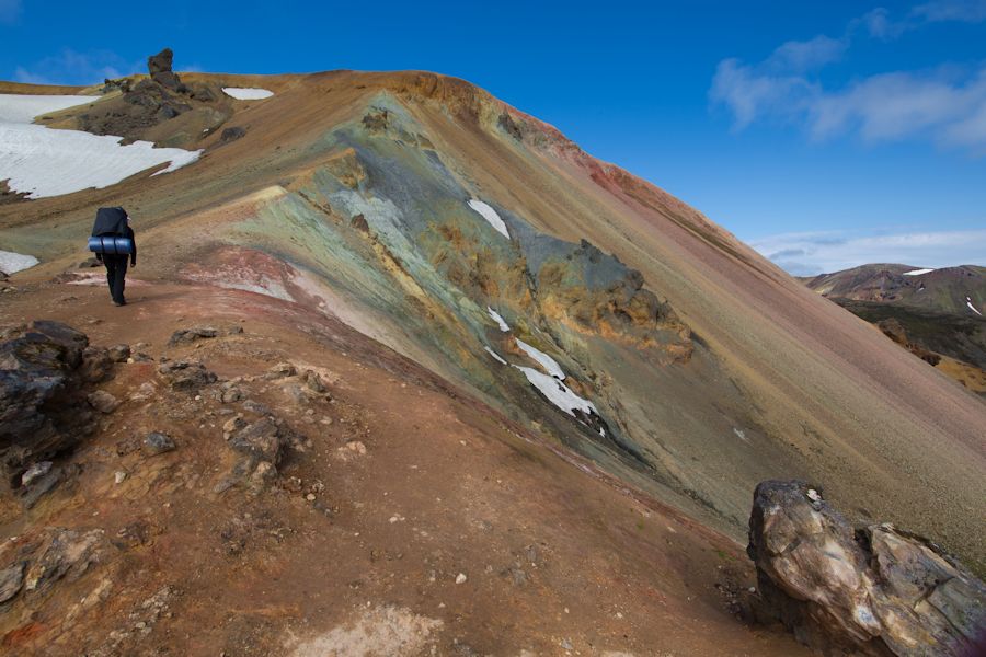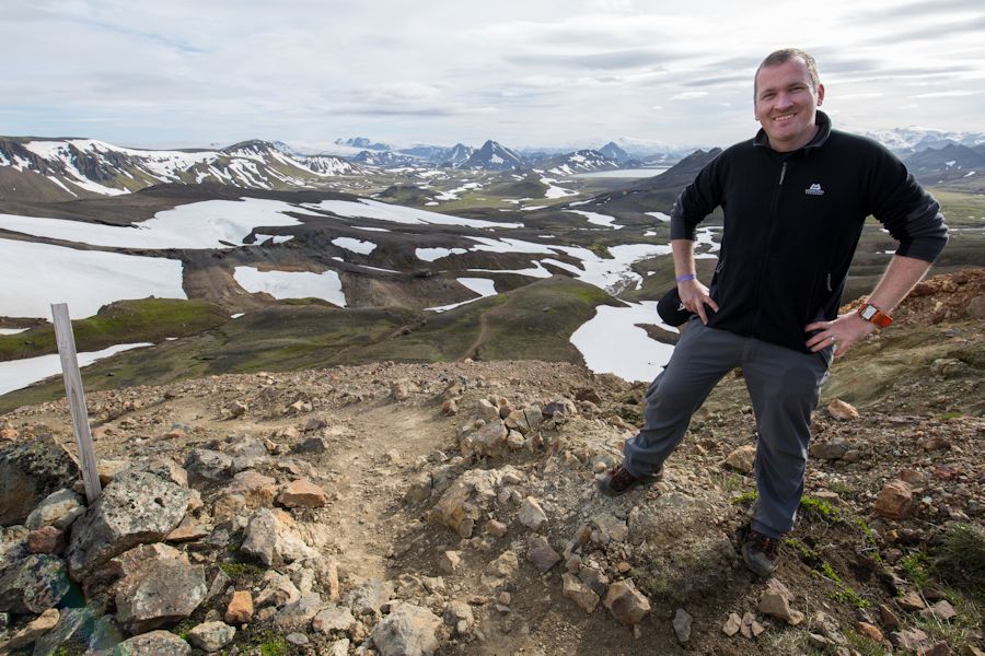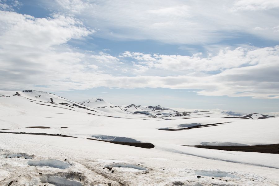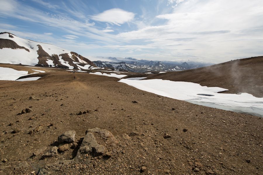 The day of the Laugavegur had finally arrived. I leant about this trail several years ago after my previous visit to Iceland. Photos I had seen online revealed an alien landscape packed with dramatic peaks, glaciers and lava flows. I knew that if it was even half as good as yesterday's climb up Blahnukur then we wouldn't be disappointed. Today was also the start of the laugavegur marathon so the camp as very busy! I believe the winning runner completed the route in under 5 hours!! The recommended time spent on the Laugevegur is 5 days to make the most of the scenery. our plan was to complete it in 3 days and then extend our journey by an extra day and complete the Fimmvörðuháls Pass too. We chose to wait for all the runners to leave camp before we set up. At 09:15 the last group of runners set off and so did we. the runners were gone and trail was quiet again. one thing we were warned about before we set off was that the trail had an unusual amount of snow still on it for july. This meant a tougher and slower day but really you couldn't complain about this walk taking too long.