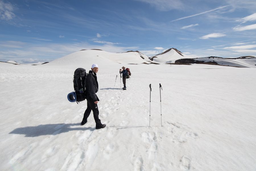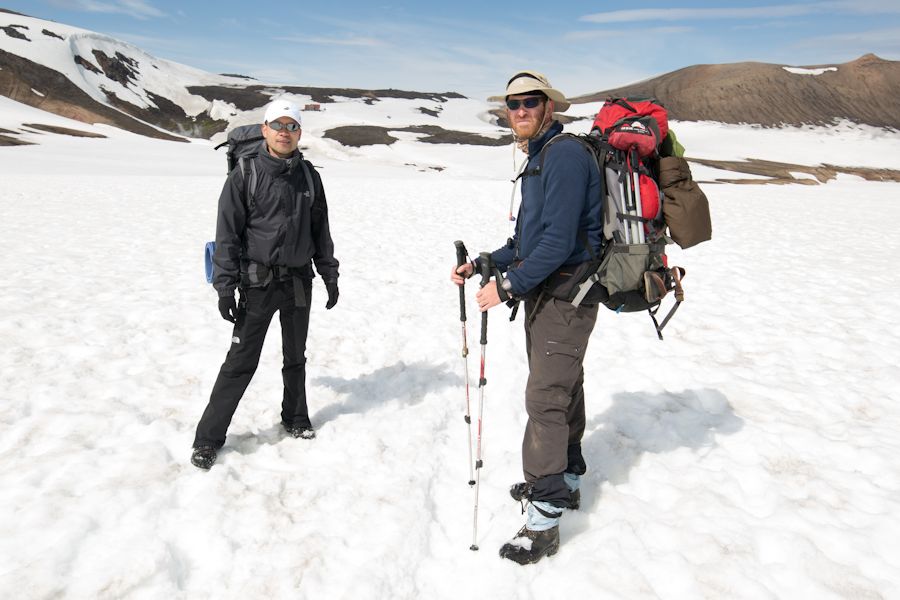 UNFORTUNATELY I HADN'T PACKED MY SUNGLASSES. WHY? BECAUSE EVERY lAUGAVEGUR VIDEO ON YOUTUBE SHOWS RAIN. I REALLY WASN'T EXPECTING SNOW AND BLAZING SUNLIGHT. This was a pretty dangerous situation to find myself in. My only option was to walk with my eyes closed as often as possible and rotate wearing alan's sunglasses.This was ok to do for half the day but any longer could have been seriously hazardous.