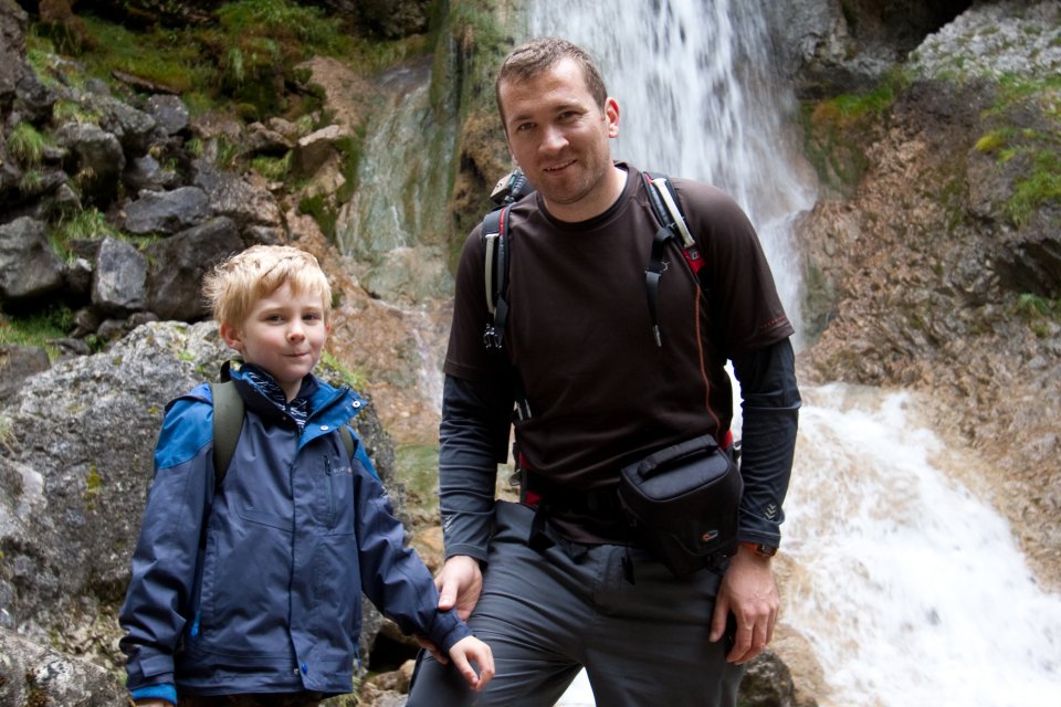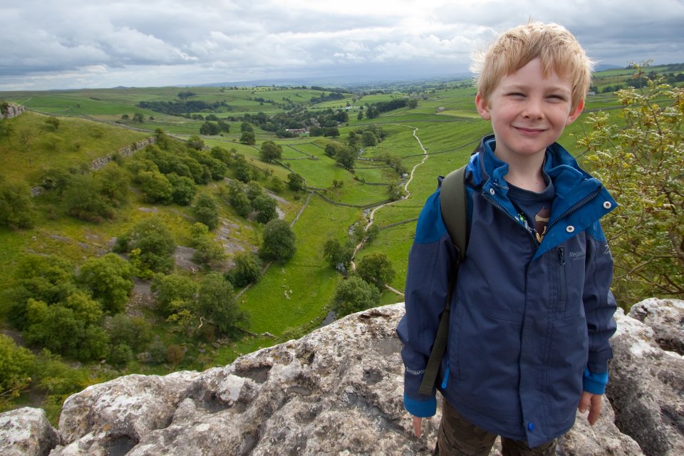 The upper section of the Gordale Beck falls. Alan giving Noah a helping hand.