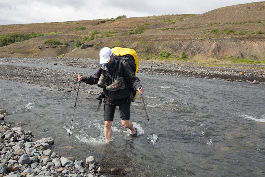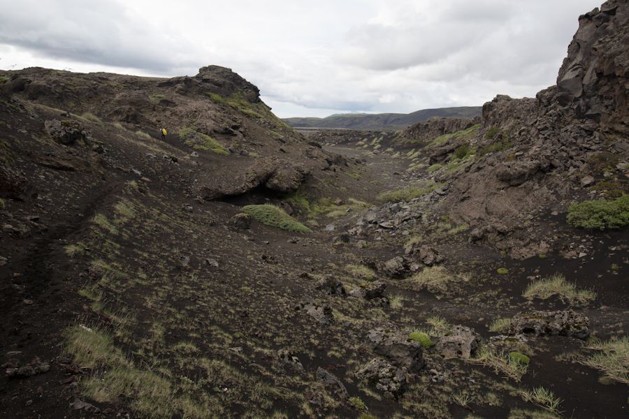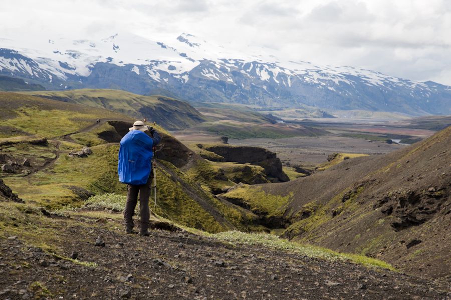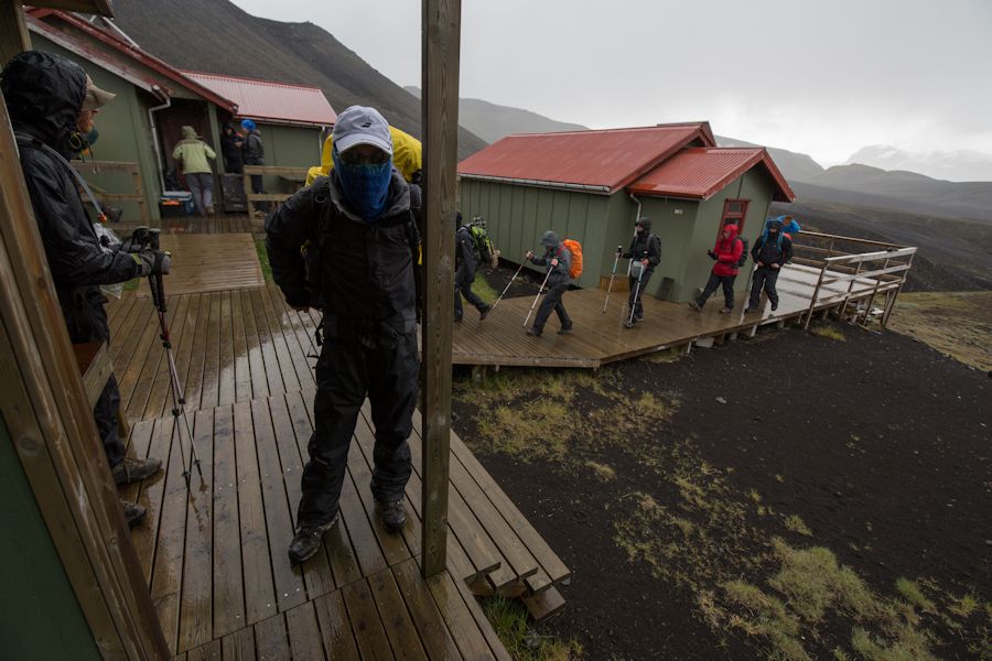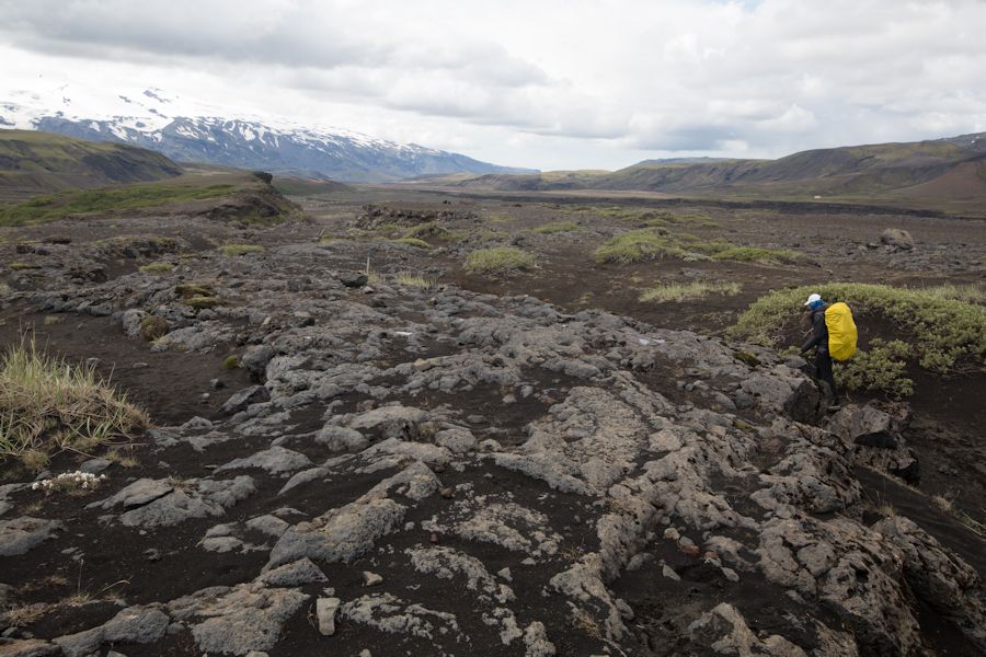 The last day of the Laugavegur Trail and it looks like our luck may have ran out. We woke to rain on the tent this morning and it didn't look as though it was going to let up any time soon. Fortunately that is just how it looked and in actual fact the rain completely stopped within 40 minutes of walking. in keeping with the pattern so far, today was another day that felt completely different to the others. Day one was high level snow, day two was a flat black desert but today became greener and richer in vegetation. and to our surprise we even saw trees. Now this section of the walk has potential risk that isn't obvious. there were signs that detailed escape routes in case the nearby katla volcano started to erupt. part of this volcano is under a glacier so even a slight rumble can send a met water flash flood down through the gorges and valleys we were walking amongst. Looking at this landscape really showed signs of these past occurrences. parts of this walk did in fact resemble river beds or maybe that's just from past basalt flows.