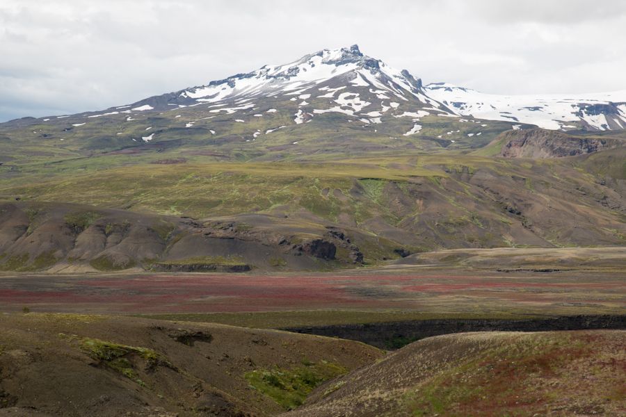 looking back from the basalt cliff to the sand flat below and the entujokull glacier in the distance.