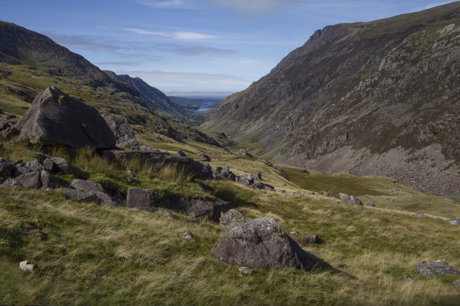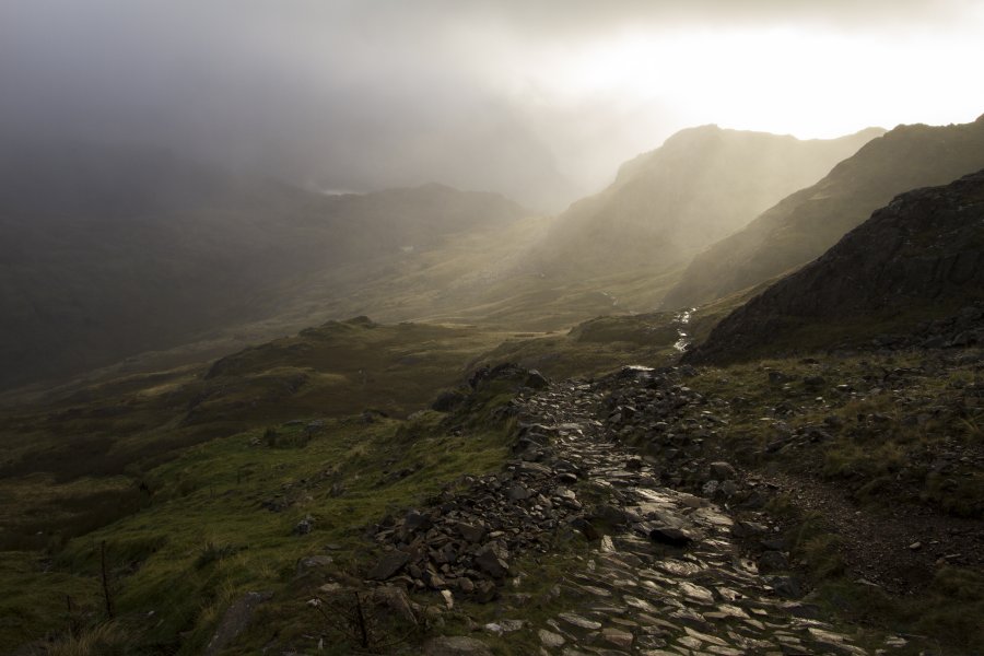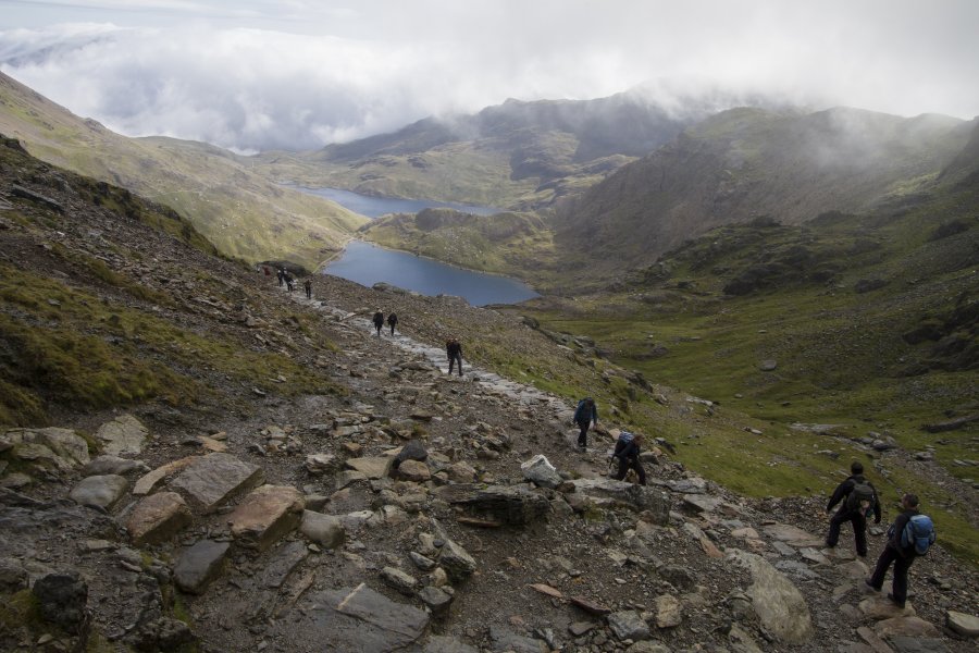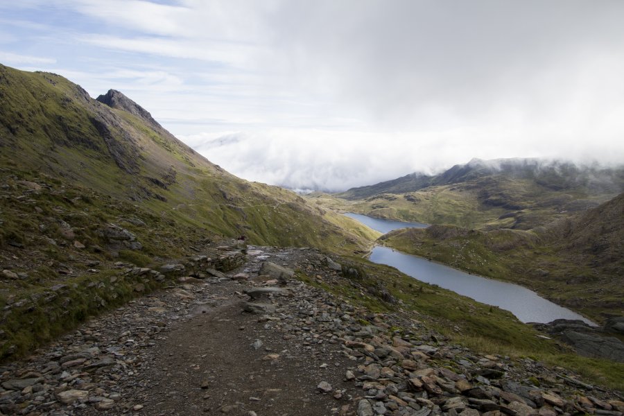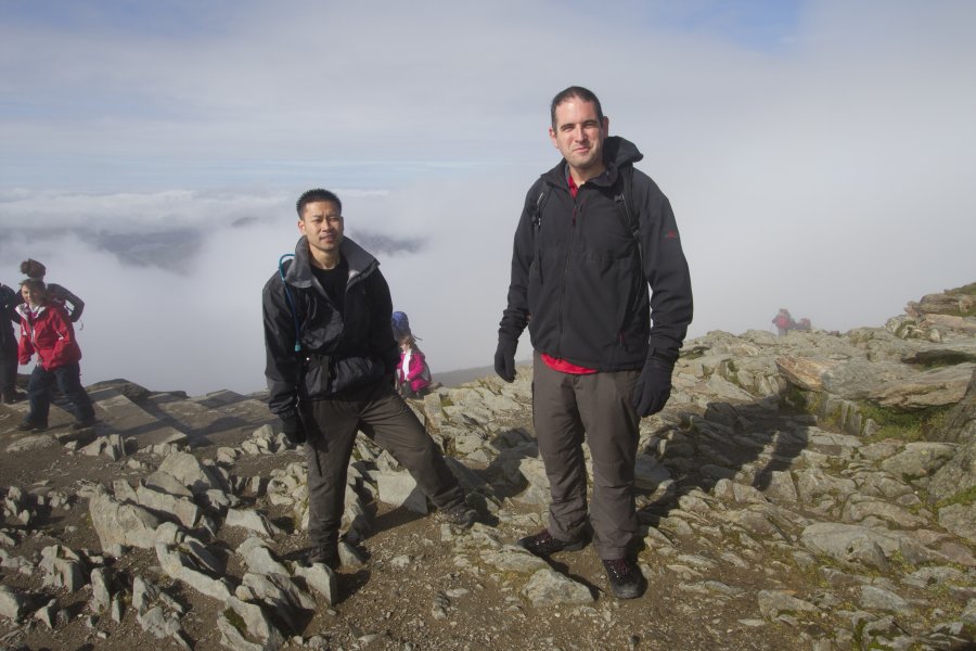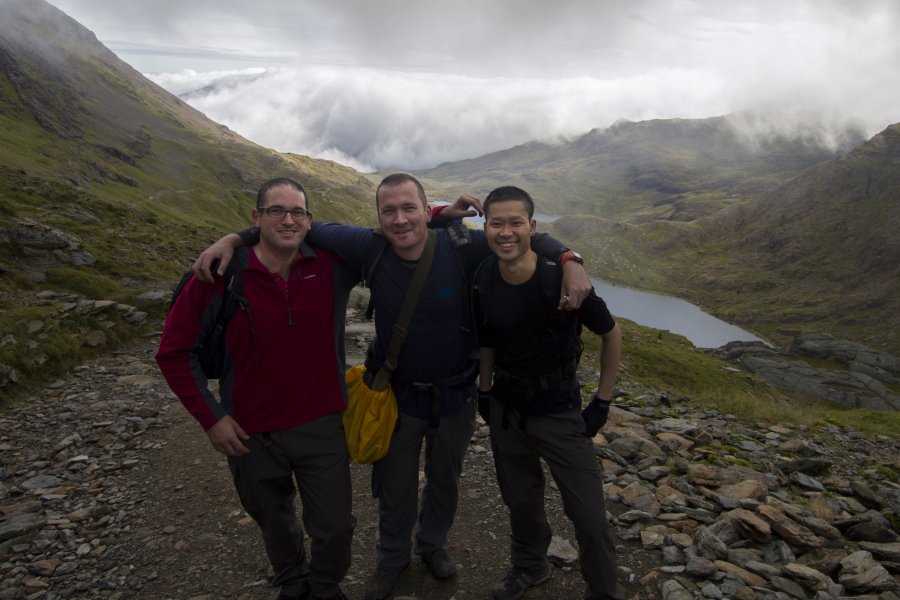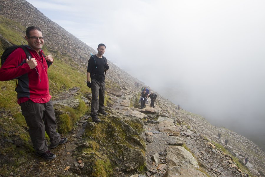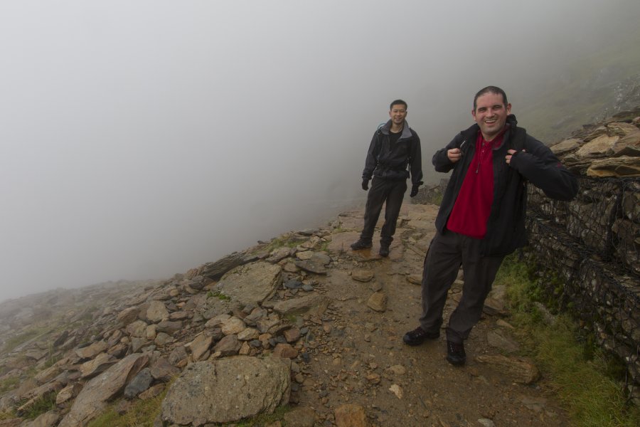 A crap night’s sleep in the tent and a few too many beers last night left me feeling cream crackered this morning. A coffee and a bacon roll at Pen-Y-Pass gave me some much needed energy for today’s clamber up Mount Snowdon. On the 3 other occasions that I have been up Snowdon I had started the walk at 2am so when we set off in dreary conditions this morning I felt accustomed to the poor visibility. I only managed to squeeze off a few photos on the way up due to how wet we were getting walking up through the cloud. We were impressed with Mark’s performance today. He looked tired when we arrived at the Snowdon Summit Café but we certainly didn’t feel like he had slowed us down. To our surprise the summit started to clear whilst we were in the café and we managed to get a few brief views of distance peaks breaking the cloud line.
