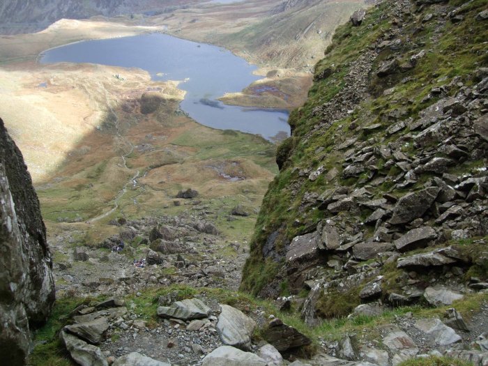 Looking across the steep scree slope. Y Garn in the back and Llyn y Cwn below