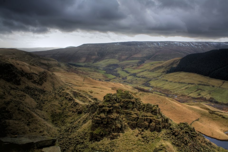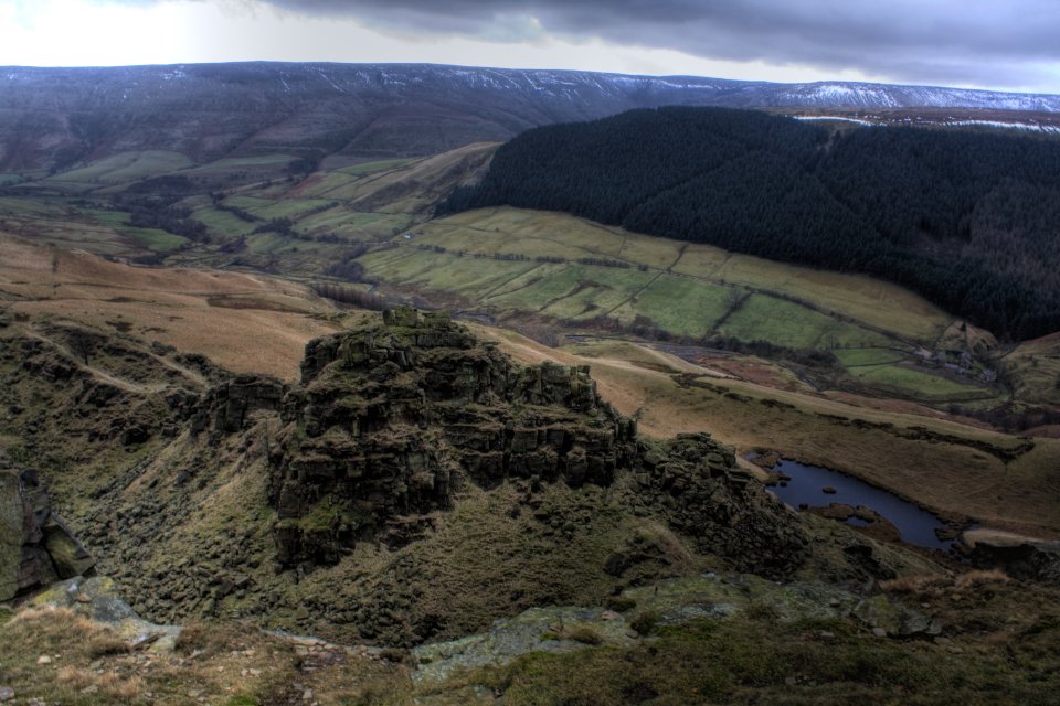 Alport Valley Plantations in the distance with a snow dusted Kinder Scout