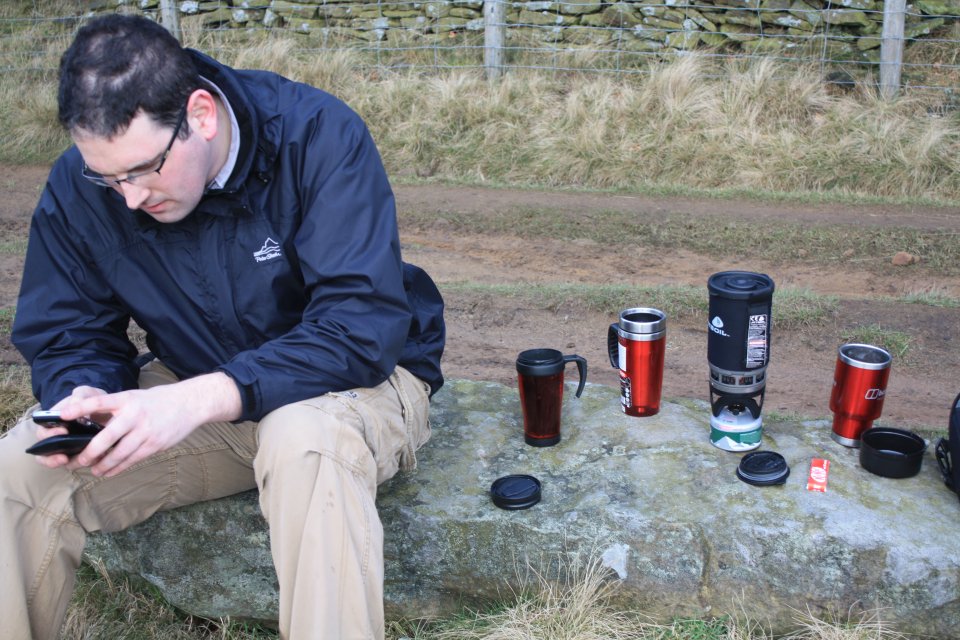 Taking a break. Drinking hot coffee and checking emails