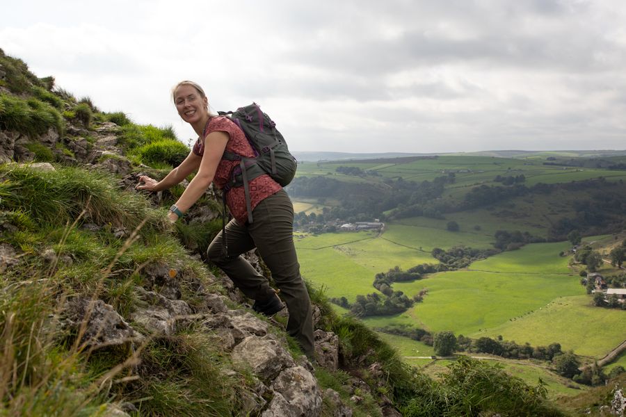 catherine approaching the summit. aldery cliff behind