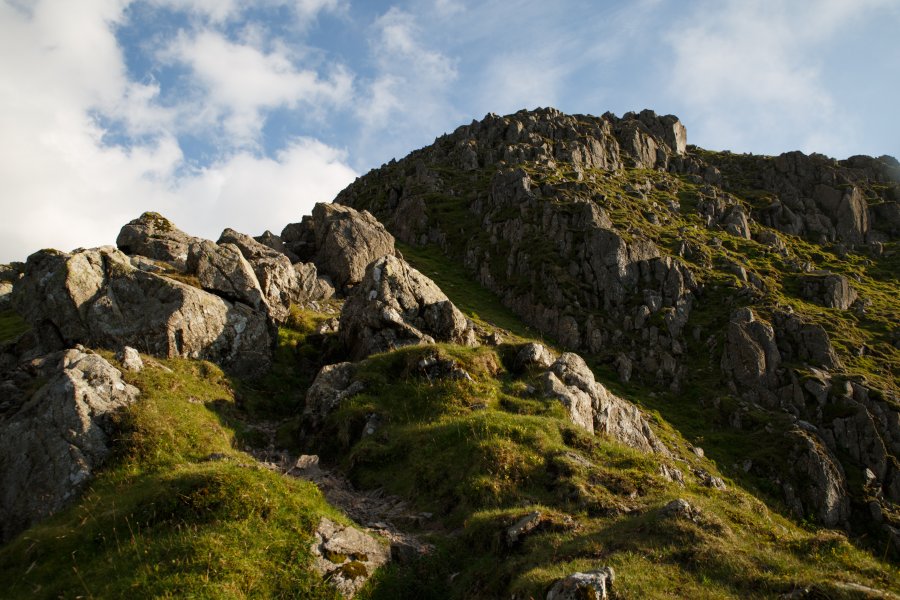 the direct route to the summit would be straight up the rock face. we fancied the longer and more adventurous high level route which you drop down onto by the right of the rock face. if i recall correctly i think there was a cairn showing it's start point. you have to climb down to the path by about 20 ft.