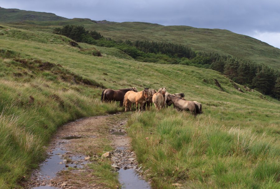 shortly into the walk i filled up my water bottle from a waterfall and within 30 minutes of walking through kinloch glen we saw the famous rum red deer. 15 minutes later and our path was blocked by rum ponies. wow! the ponies didn't seem at all fazed as we squeezed past them on the path and joined the faint track leading to glen shellesder. our destination was the bothy in guirdil bay. looking down glen shellesder to the coast didn't look far at all but became a boggy twisting slog of a journey. this was real wilderness terrain. tiring and slow but exciting!