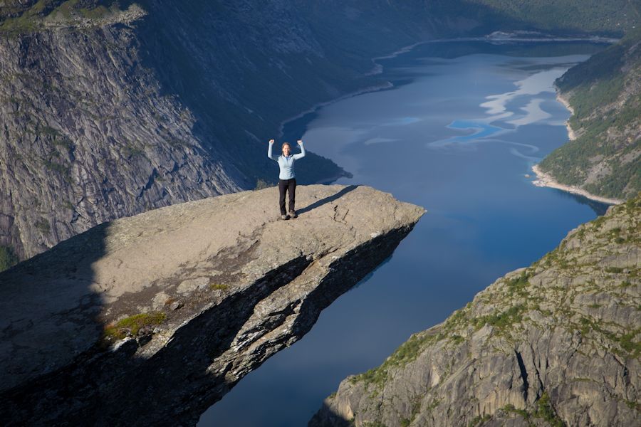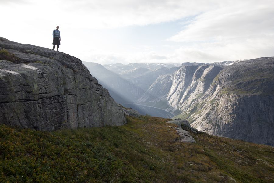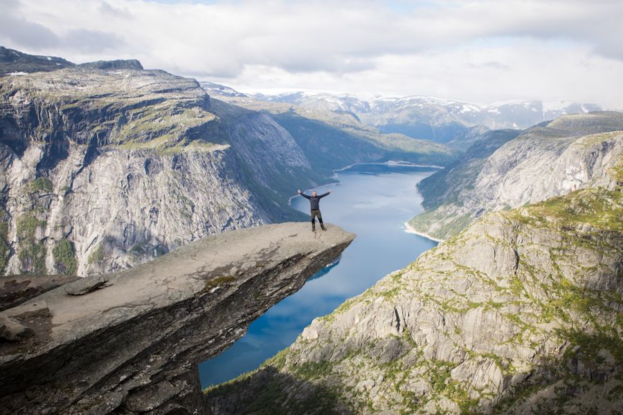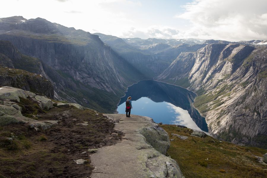 At last, I breathed a sigh of relief when I saw a small group gathered together in the distance and I knew this is where Trolltunga would be. When I approached the area, I have to get right to the edge to see Trolltunga; none of this viewing from the back row lark; if you’re here to see these things but want to view them from a distance, then there’s no point going. Before you step on to the object, you have to descend a set of metal rungs. When you’re on it, there’s a slight incline before you reach the ‘tip’ which feels more settling as your body automatically leans towards safety and you don’t feel like you’re going to topple over the edge.