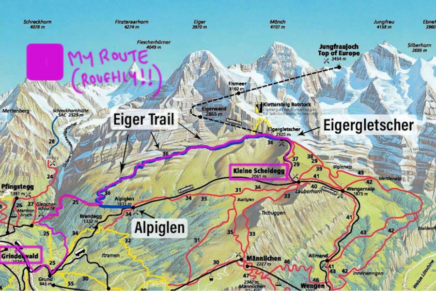 I'm a mountain geek and I also love the book, The White Spider by Heinrich Harrer, so whilst in Switzerland, walking the Eiger Trail was a must do. We were staying just outside of Lauterbrunnen so we took the train up to Kleine Scheidegg. The trail starts just a short walk beyond the hotel and traverses the foot of the Eiger. the most common route is to follow the path down to alpiglen and get the train back but we chose instead to continue the traverse and make our way down to Grindelwald. Take a look at my roughly drawn route above in Purple. The trail was well marked with swiss flags so we were fairly confident we wouldn't get lost. The trail continued through woodland and then switched back and down to grindelwald. It was then just a case of getting the train back to Lauterbrunnen.
