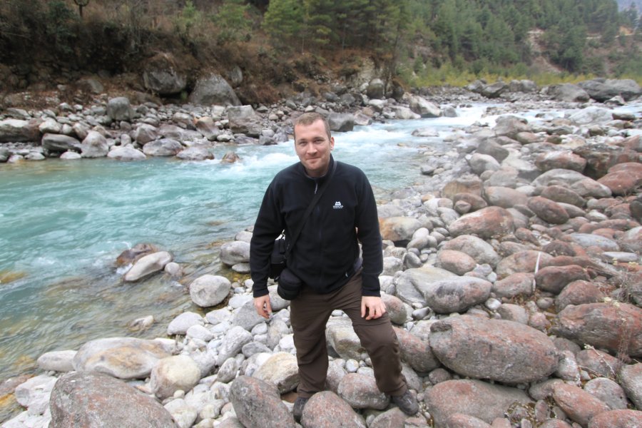 Relaxing by the river. We were goofing around by a river in the Himalayas. Just slightly overwhelming.