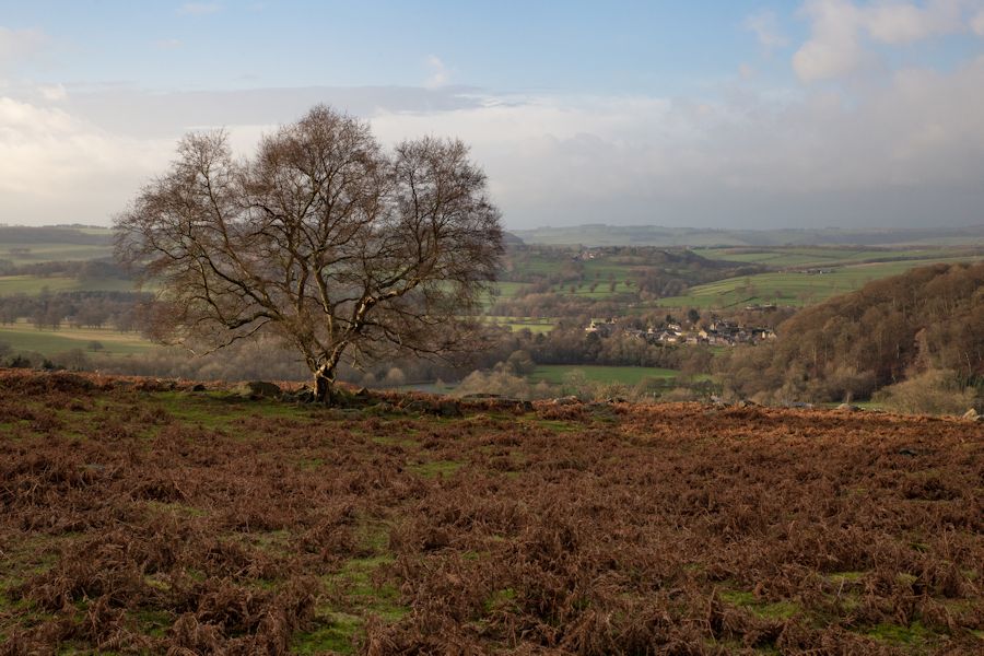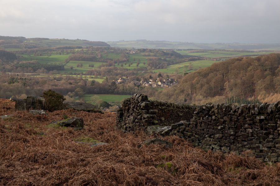 looking back down to Baslow in the distance and Yeld Wood