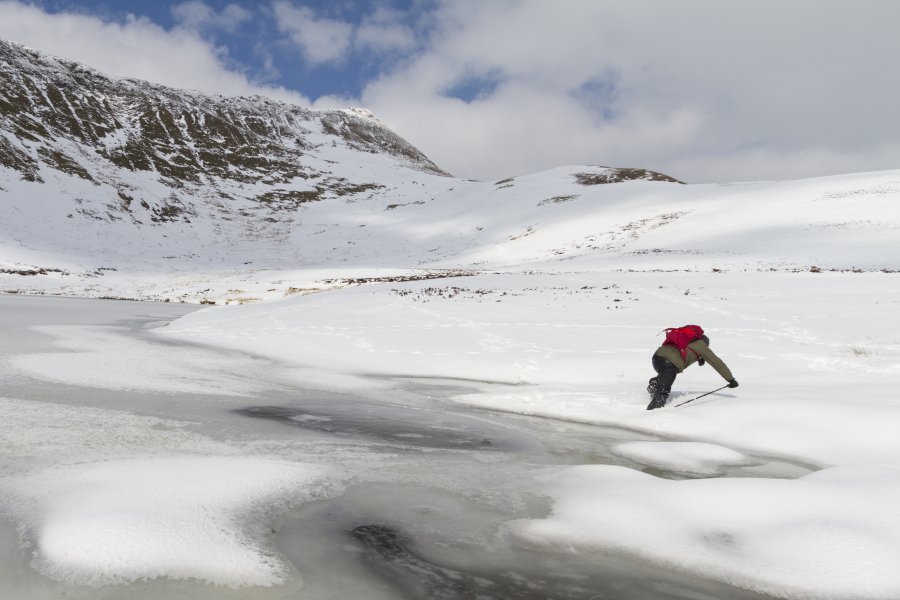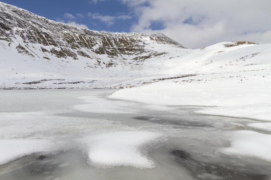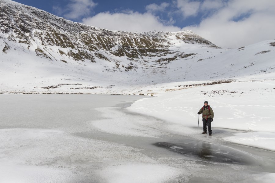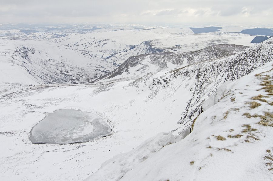 Llyn Lluncaws was completely frozen over.. at least that's what we thought until Mark broke through the edge for some wet foot surprise. The sun was now out and the glare reflecting from the snow had a surprisingly immediate impact on our skin. Red faced from wind burn and snow glare we made our way back following the steep slope below Cerrig Poethior.