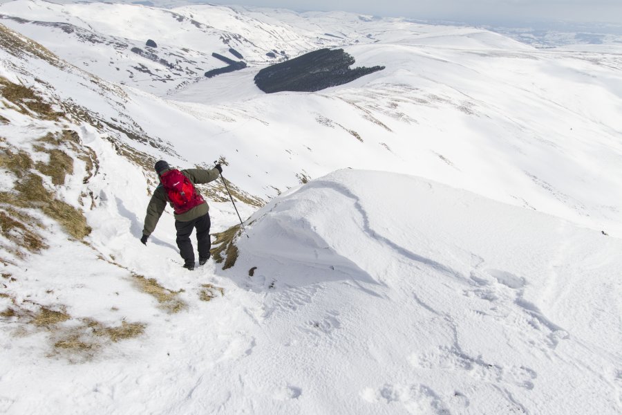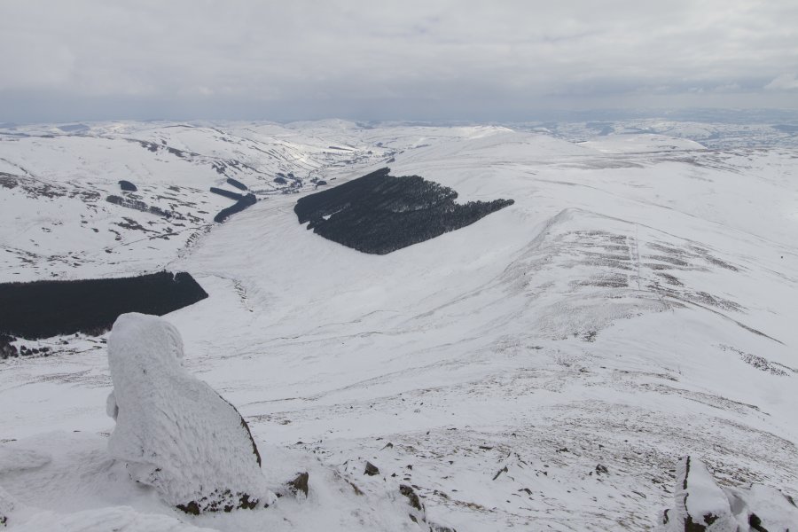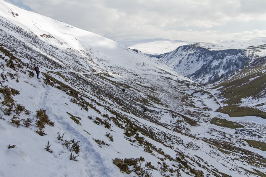 We finally reached Moel Sych summit and traversed the ridge line to Cadair Berwyn. As often the case, the sun decided to come out as we made our descent. The descent track that sweeps around Moel yr Ewig was very slippery and steep. A slip here in the snow could have resulted in a nasty fall. (ice axe and crampons advised). The last section of this descent was tackled 'bum to snow' with our walking poles as arrest devices. It certainly made things less tiring on the thighs and safer on this very steep section.