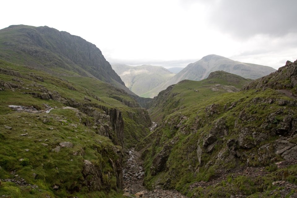 Top of Piers Gill. Walkers from a Portsmouth church completing the Three Peaks to the right.