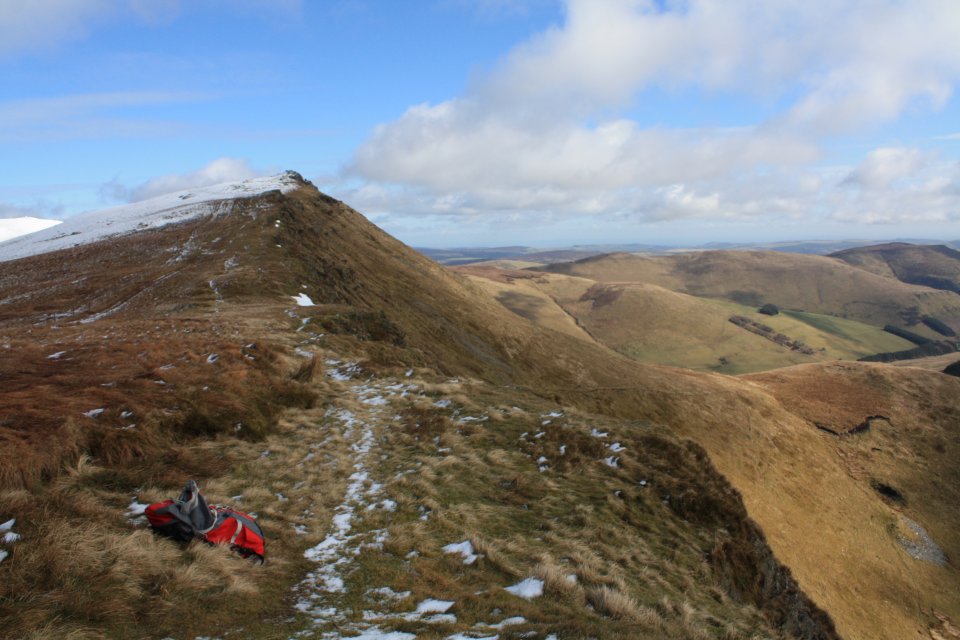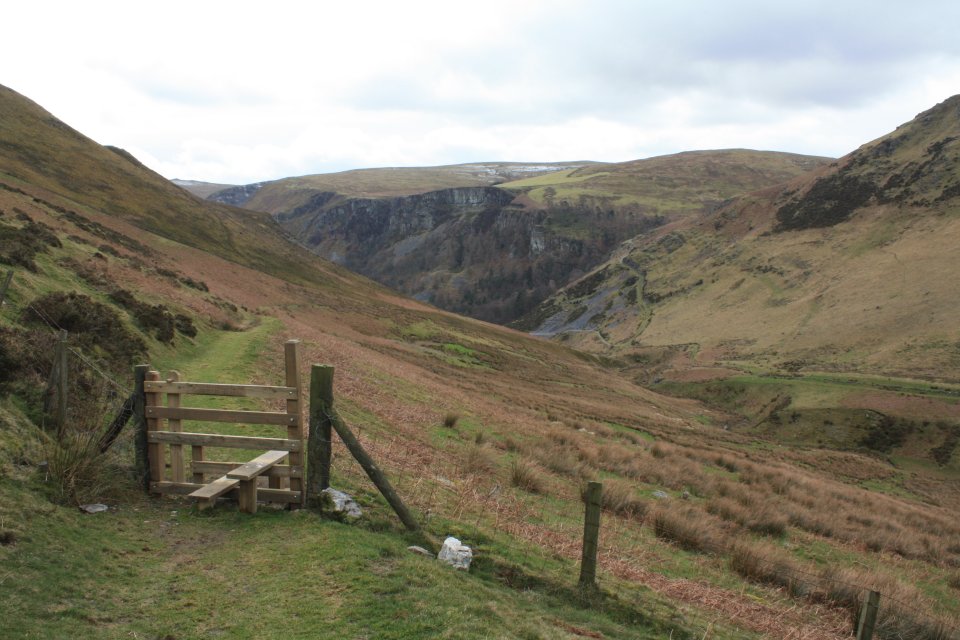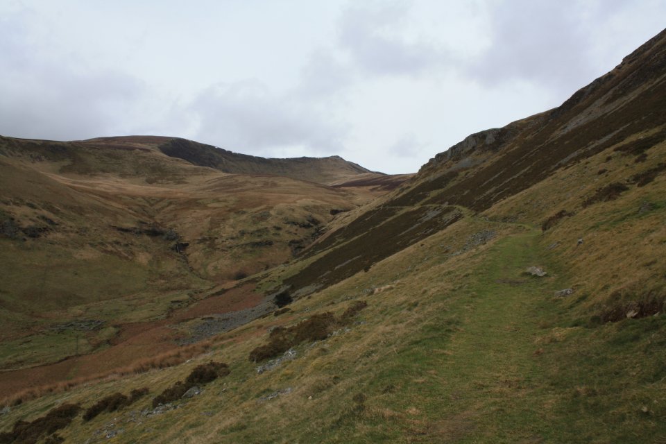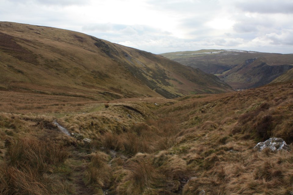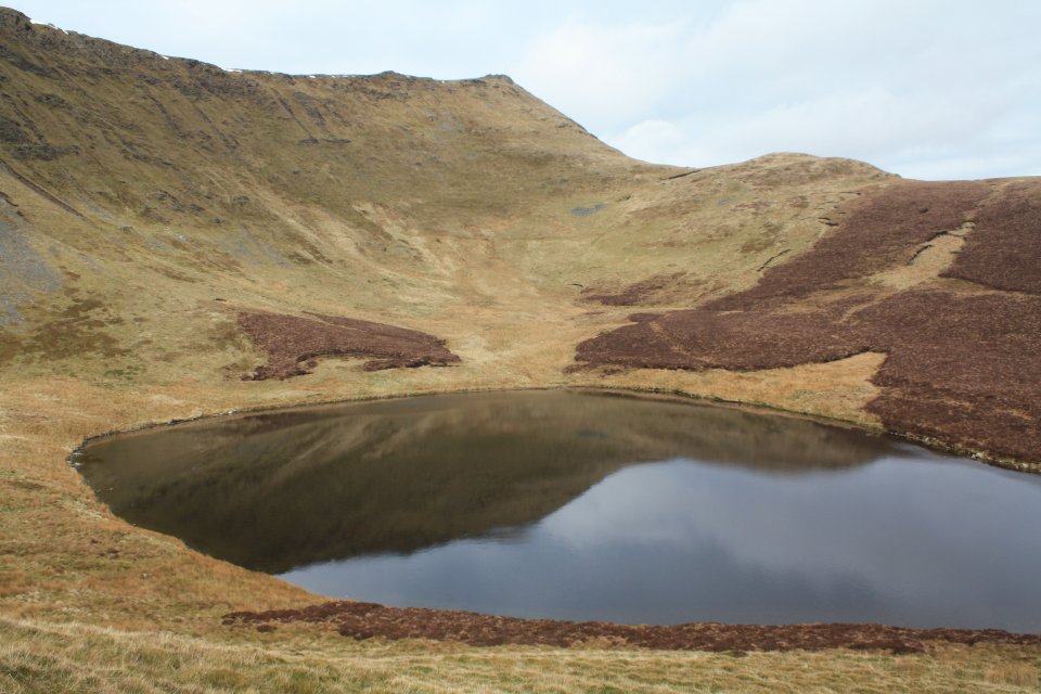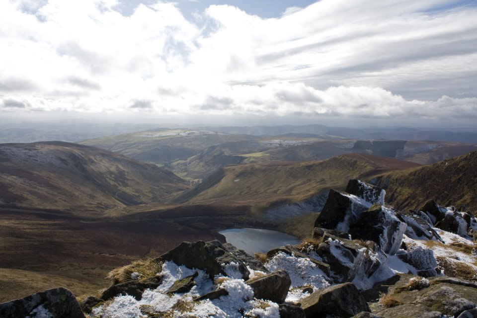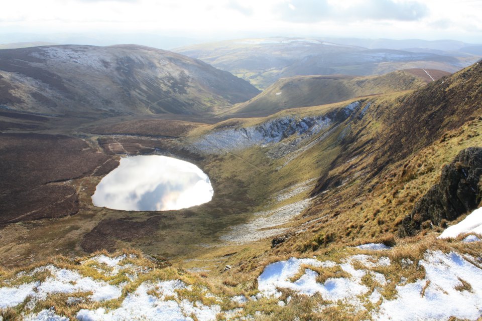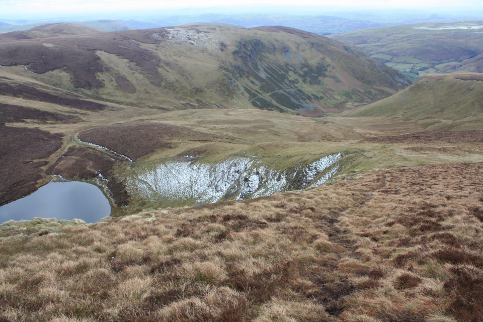 Looking down from the Cadair Berwyn ridge to the tarn of Llyn Lluncaws