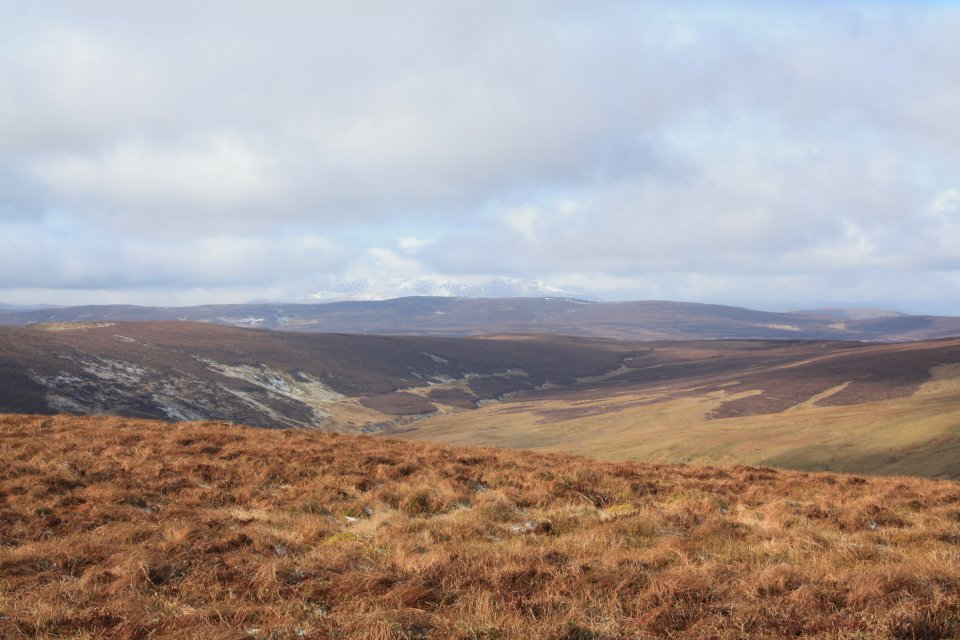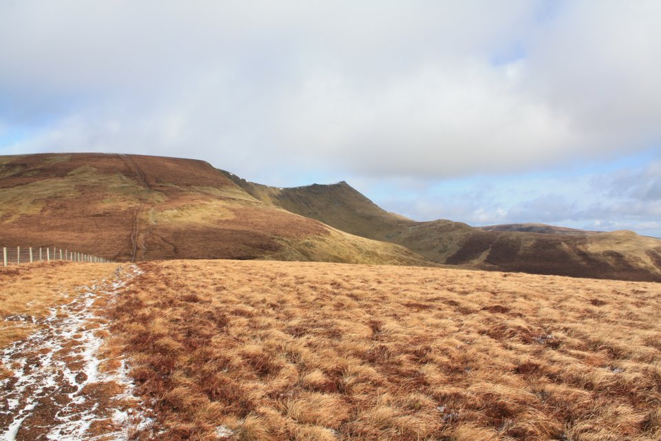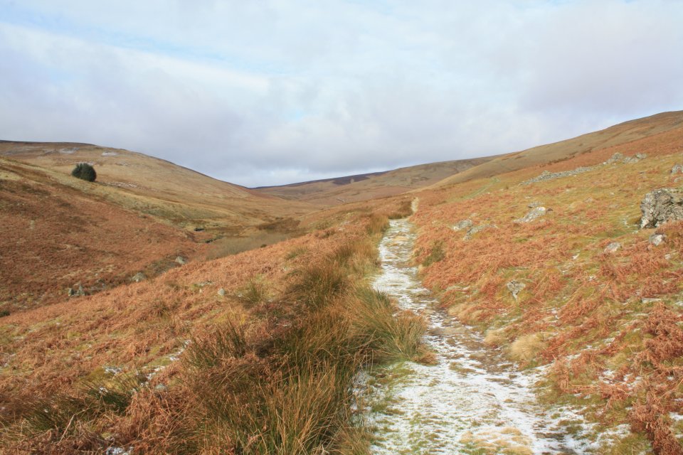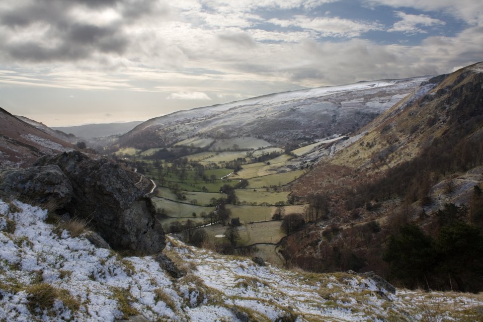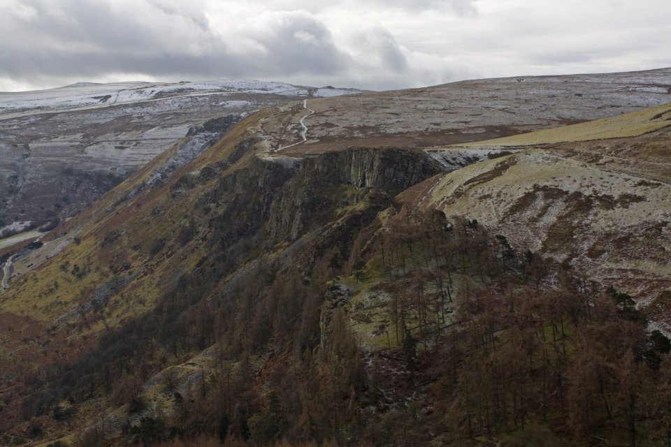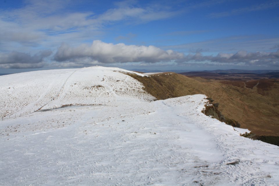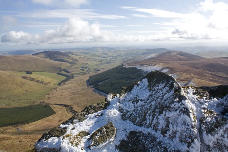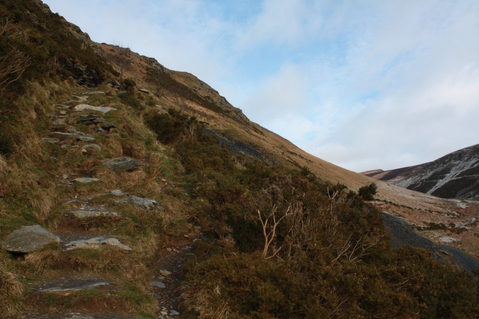 Looking down from the Cadair Berwyn ridge to the tarn of Llyn Lluncaws