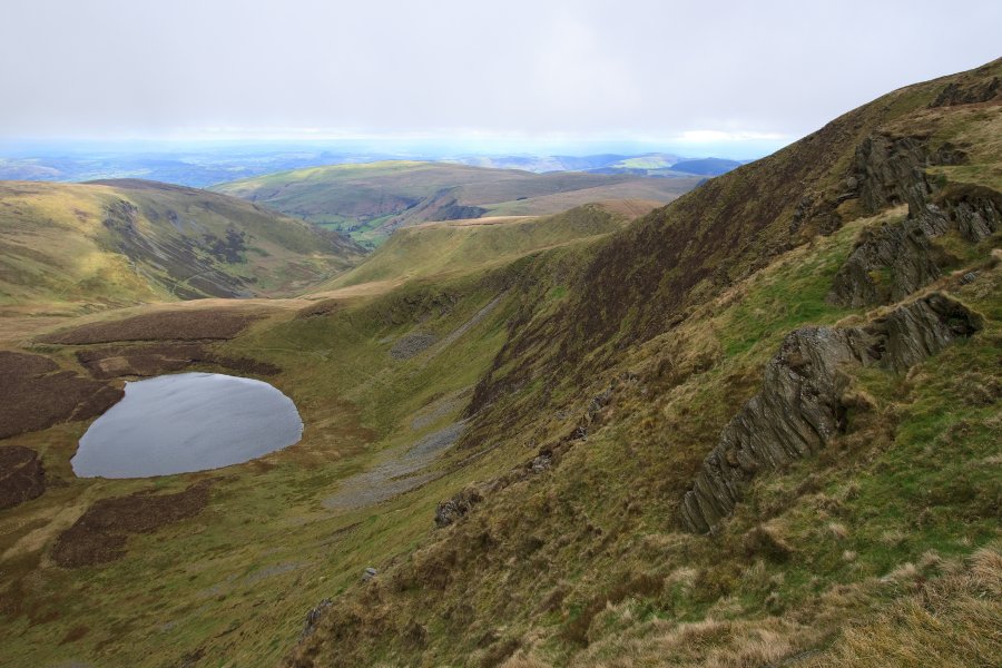 Looking out from Craig y Llyn down to Llyn Lluncaws