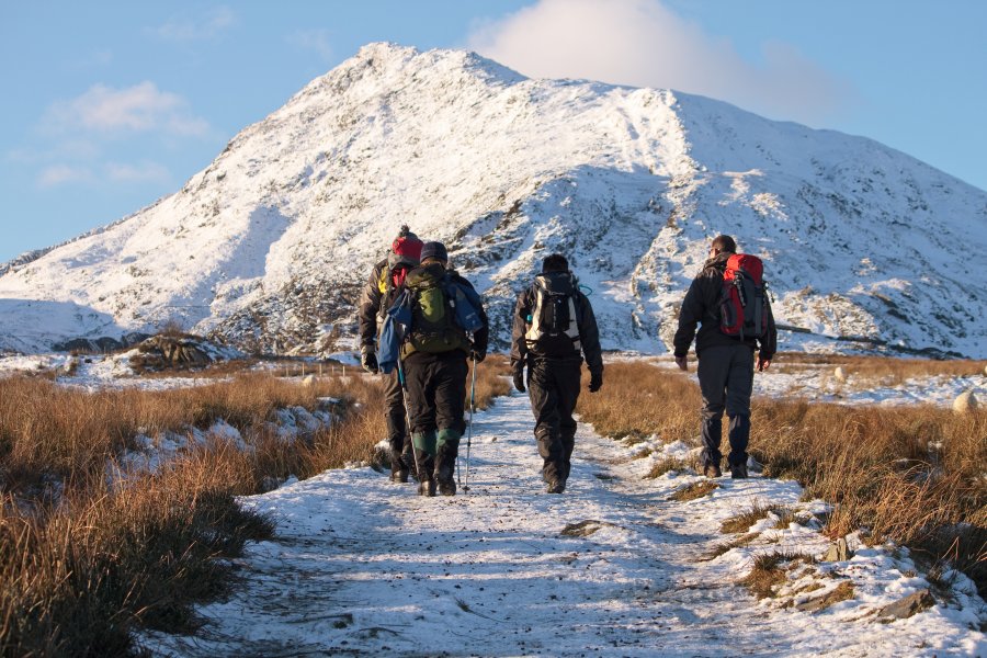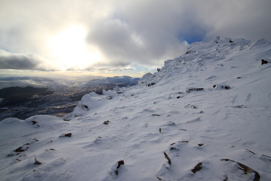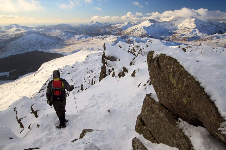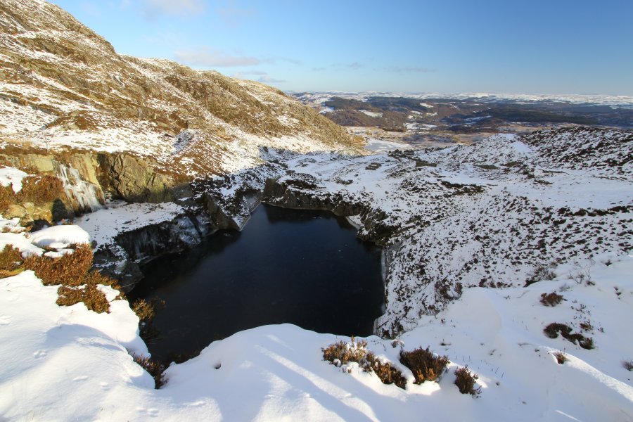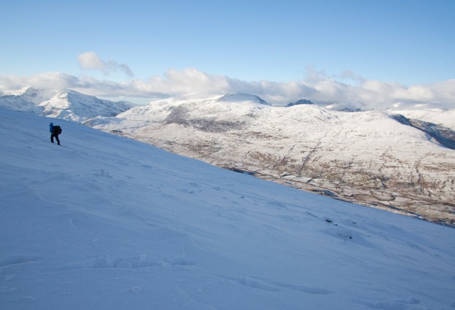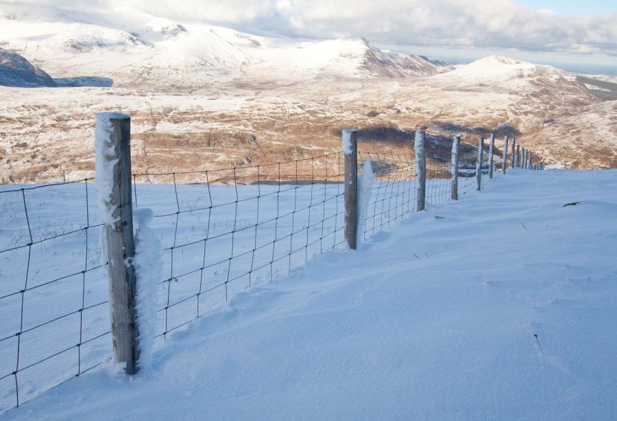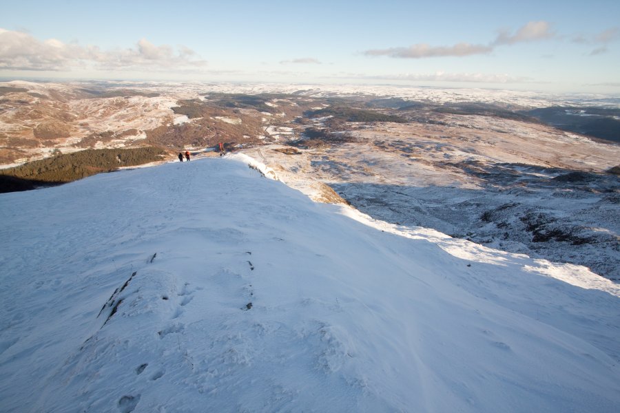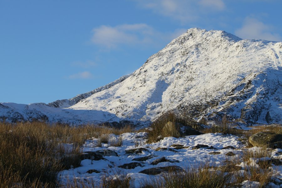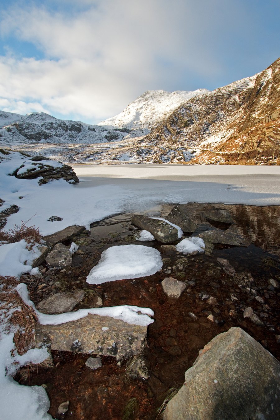 The Daear Ddu ridge in full view and a completely frozen Llyn y Foel to the left