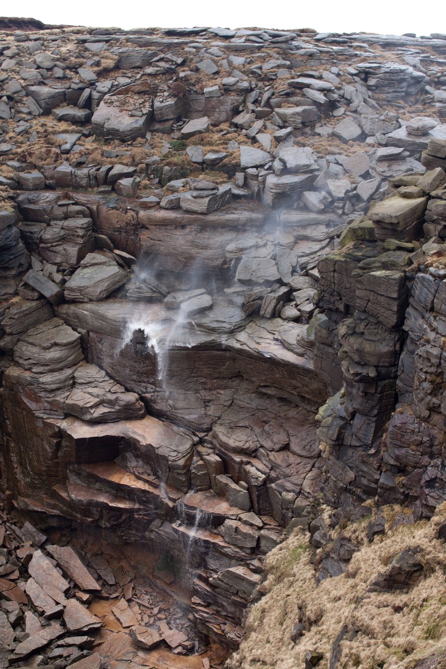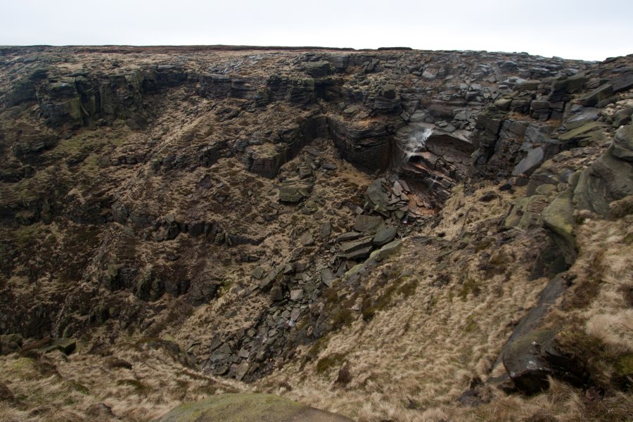 WITH PLENTY OF CALORIES TO BURN WE PUSHED ON TO THE KINDER LOW TRIG POINT. ONE THING I WAS CERTAIN OF WAS HOW COLIN WOULD BE Impressed with the strange landscape around the kinder plateau. it has a very bleak lunar feel to it. mounds of black peat here and there with strange smooth rock formations littered across the area like the bottom of a goldfish bowl. it's certainly like no other place i know of. after passing the equally impressive and strange, kinder downfall, we followed our route across sandy heys and down into william clough.