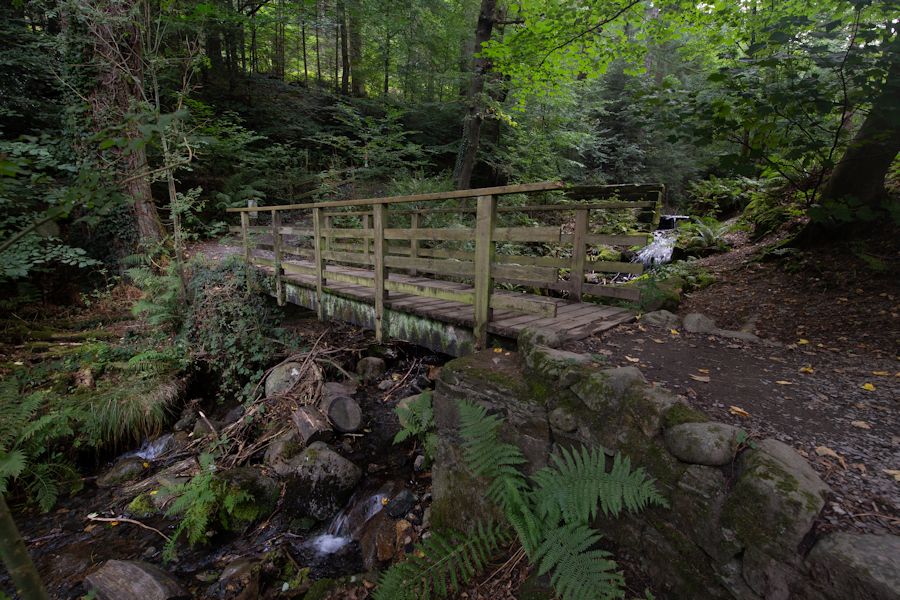 after backtracking from the summit slightly, we re-entered the forest. a footbridge within longside wood