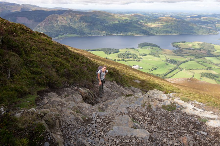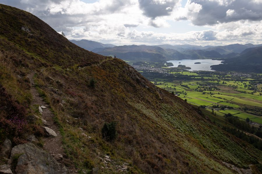 heading down carl side with derwent water and keswick ahead