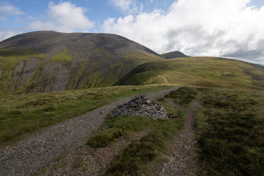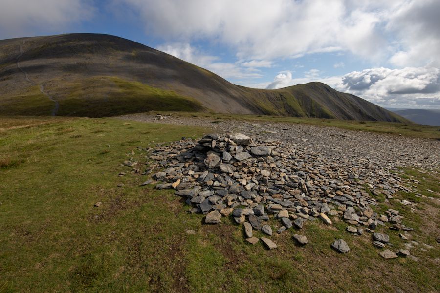 a cairn as we come to the end of longside edge. skiddaw (left) and carl side (right)