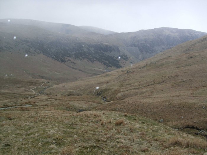 Light snow starts to fall as we return following Red Tarn Beck