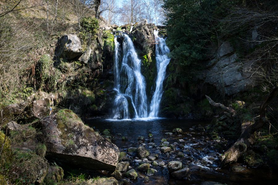 WE PARKED UP IN THE BOLTON ABBEY GROUNDS NEXT TO THE CAVENDISH PAVILLION AND IMMEDIATELY CROSSED THE RIVER WHARFE FOLLWING THE SIGNS POINTING TO SIMON'S SEAT. IT'S ABOUT 5KM TO SIMON'S SEAT AND TO GET THERE YOU GO THROUGH THE VERY SCENIC VALLEY OF DESOLATION. NOW THAT'S NOT THE PRETTIEST OF NAMES BUT THE VALLEY ITSELF IS ACTUALLY VERY PICTURESQUE WITH AN IMPRESSIVE WATERFALL.