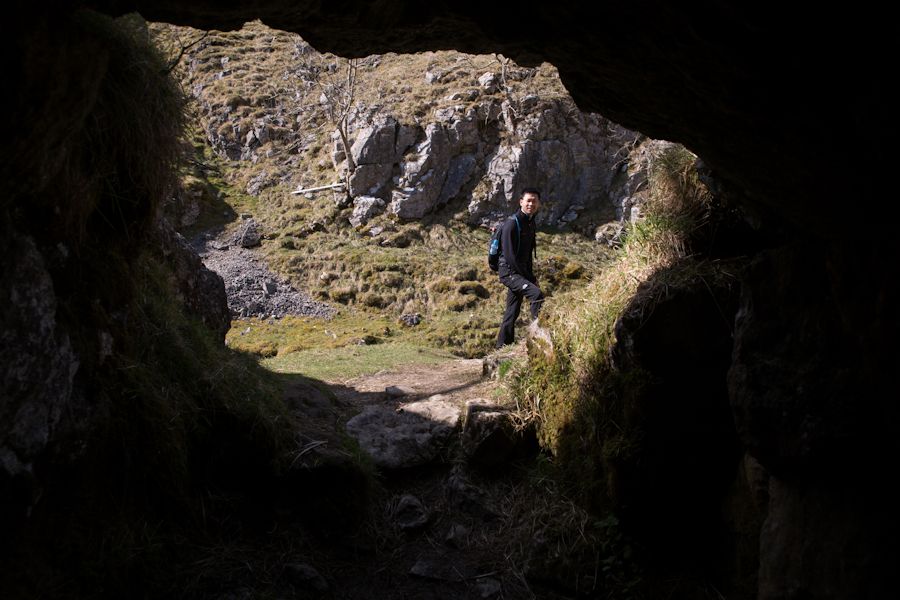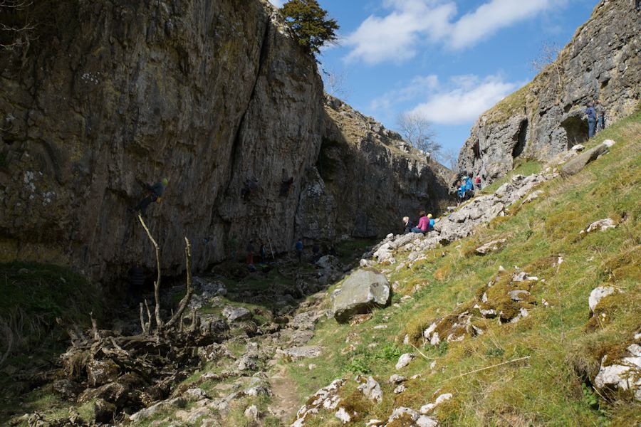 heading north we descended to dale head farm and then followed skyreholme beck to trollers gill. i told alan to bring his headtorch as i knew of a tunnel we could explore. doing a bit of google researching beforehand showed photos of trollers gill with the beck running through it. today it was dry and apparently it is most of the year. we didn't see any trolls but we did come across a large group of climbers clinging to the sides of the gorge.