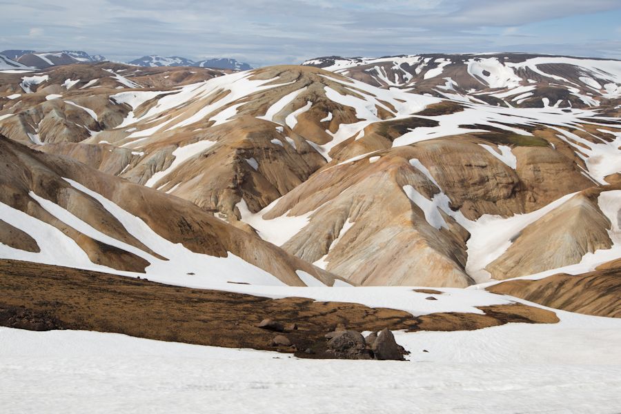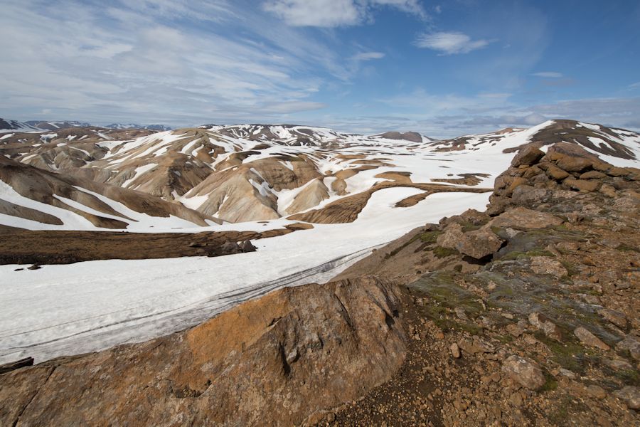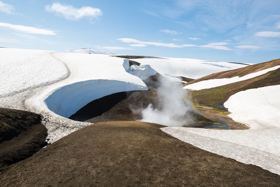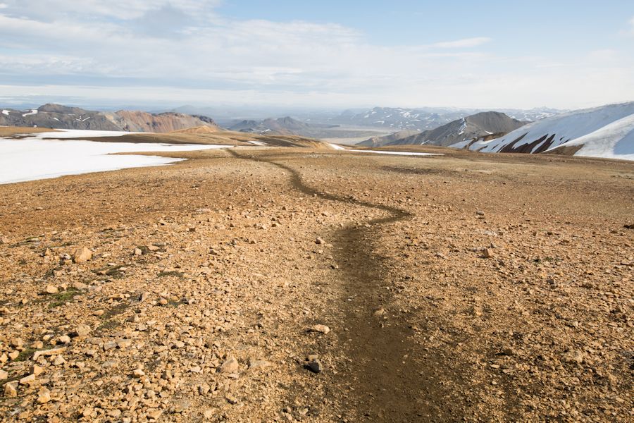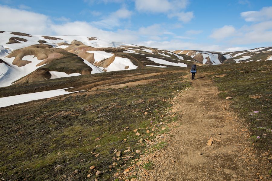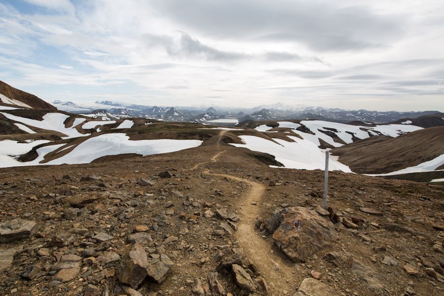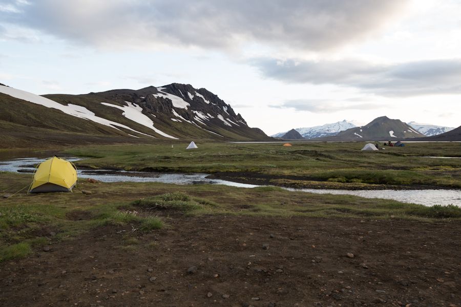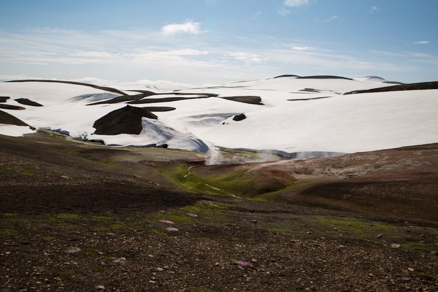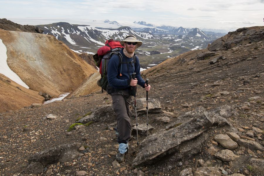 The day of the Laugavegur had finally arrived. I leant about this trail several years ago after my previous visit to Iceland. Photos I had seen online revealed an alien landscape packed with dramatic peaks, glaciers and lava flows. I knew that if it was even half as good as yesterday's climb up Blahnukur then we wouldn't be disappointed. Today was also the start of the laugavegur marathon so the camp as very busy! I believe the winning runner completed the route in under 5 hours!! The recommended time spent on the Laugevegur is 5 days to make the most of the scenery. our plan was to complete it in 3 days and then extend our journey by an extra day and complete the Fimmvörðuháls Pass too. We chose to wait for all the runners to leave camp before we set up. At 09:15 the last group of runners set off and so did we. the runners were gone and trail was quiet again. one thing we were warned about before we set off was that the trail had an unusual amount of snow still on it for july. This meant a tougher and slower day but really you couldn't complain about this walk taking too long.