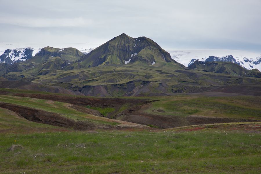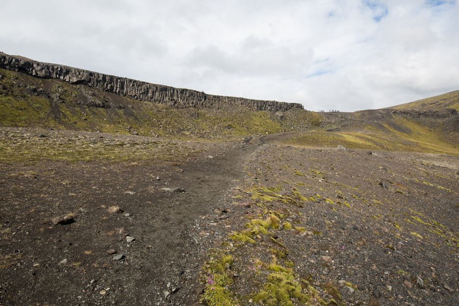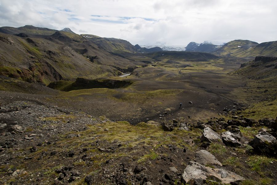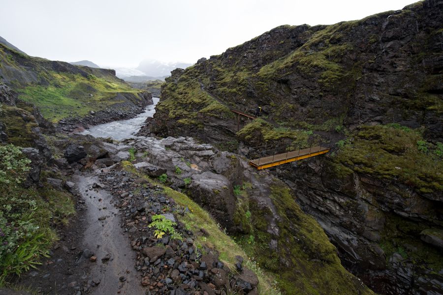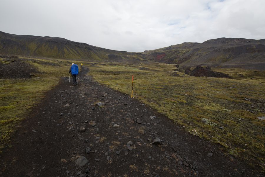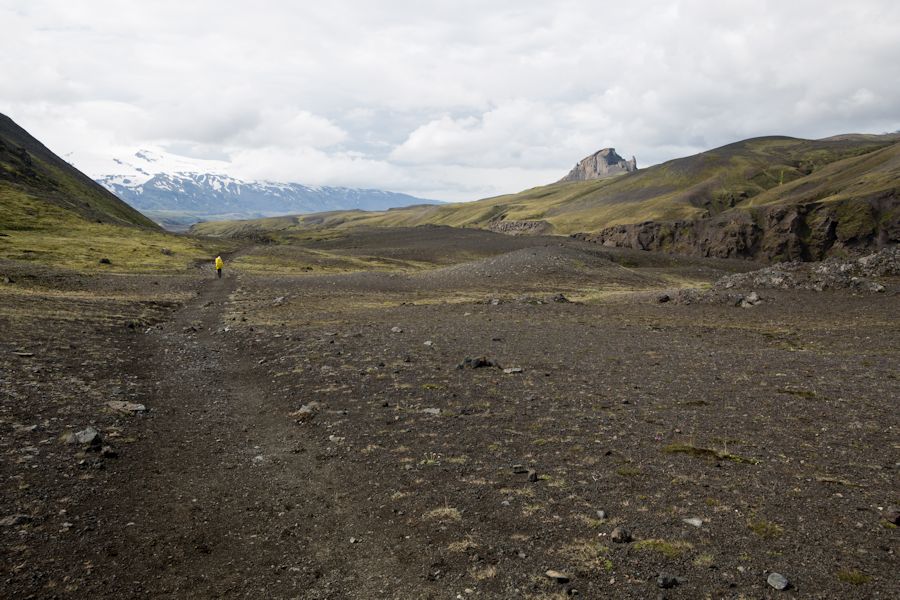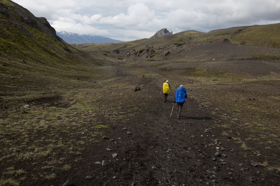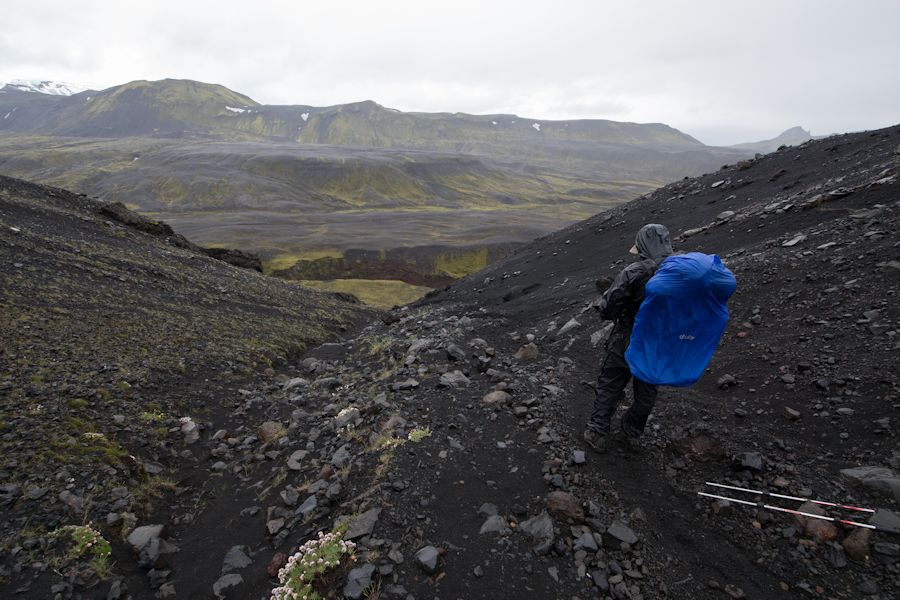 The last day of the Laugavegur Trail and it looks like our luck may have ran out. We woke to rain on the tent this morning and it didn't look as though it was going to let up any time soon. Fortunately that is just how it looked and in actual fact the rain completely stopped within 40 minutes of walking. in keeping with the pattern so far, today was another day that felt completely different to the others. Day one was high level snow, day two was a flat black desert but today became greener and richer in vegetation. and to our surprise we even saw trees. Now this section of the walk has potential risk that isn't obvious. there were signs that detailed escape routes in case the nearby katla volcano started to erupt. part of this volcano is under a glacier so even a slight rumble can send a met water flash flood down through the gorges and valleys we were walking amongst. Looking at this landscape really showed signs of these past occurrences. parts of this walk did in fact resemble river beds or maybe that's just from past basalt flows.