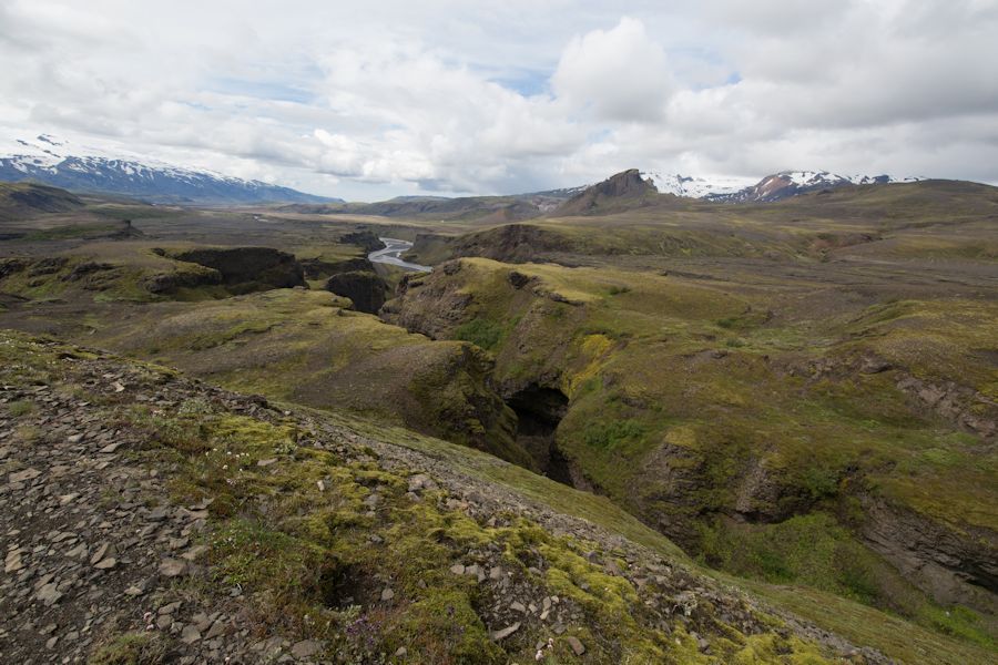 looking back from the basalt cliff to the sand flat below and the entujokull glacier in the distance.