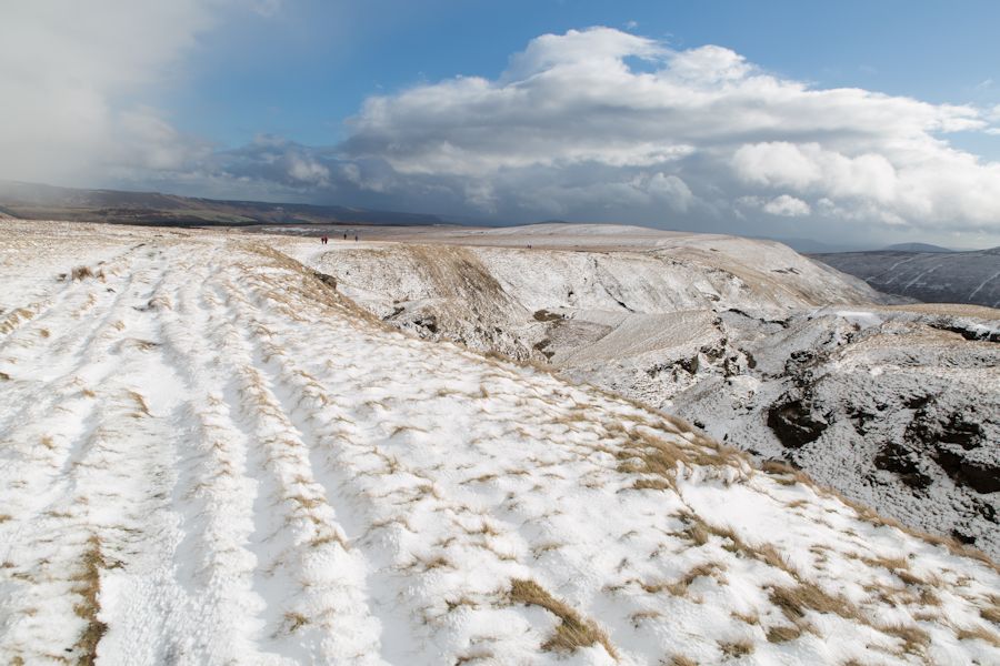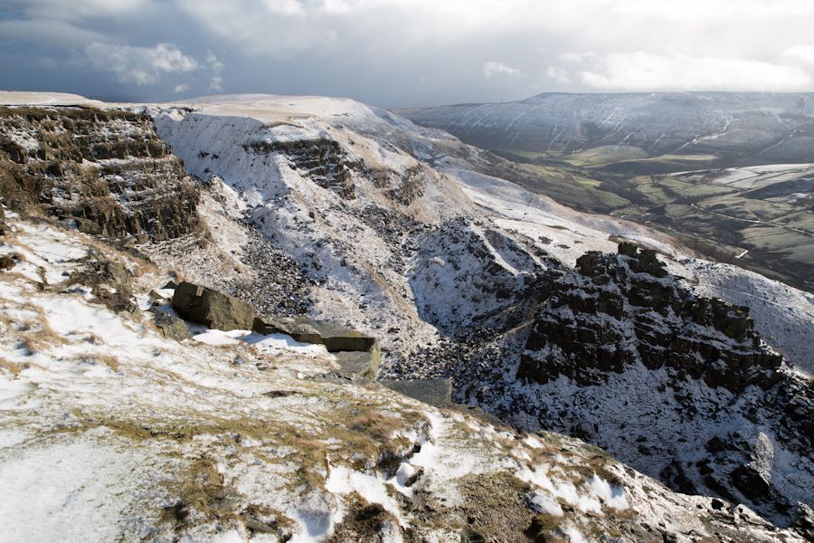 as we crossed the moor towards alport castles one of those snow blizzards kicked off again but this time a horizontal, swirling and dense onslaught that reduced visibility to about 10 feet. we decided to stop and huddle together for a few minutes. i said to Noah, "If it stays like this then we should turn back and drop back down to the reservoir as we wont see anything going this way". Noah agreed and we continued to wait out the blizzard. fortunately we weren't waiting for long AND IT TURNED OUT TO BE WELL WORTH IT TOO. 10 MINUTES LATER WE WERE AT ALPORT CASTLES WITH BLUE SKies AND A SPLENDID VIEW. NOw it was either this view or the knowledge that we were now walking in the direction of the car that perked Noah up. Whatever the reason i was pleased he was happier.