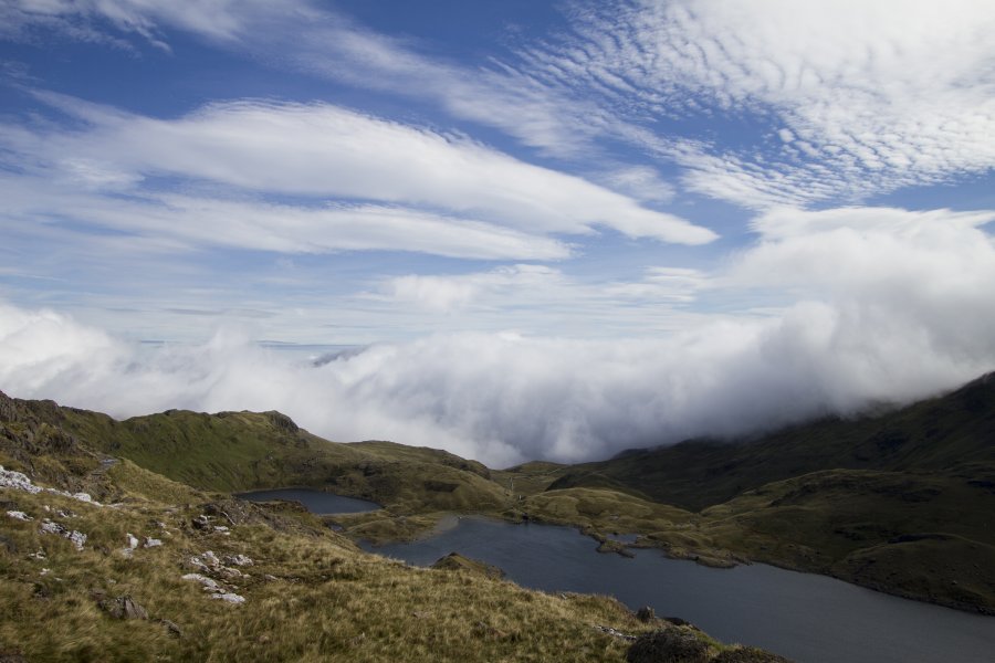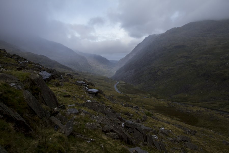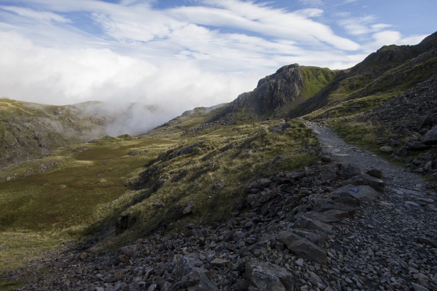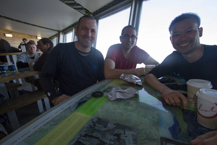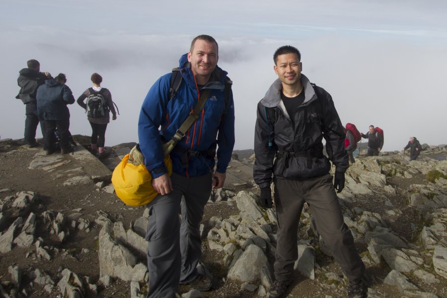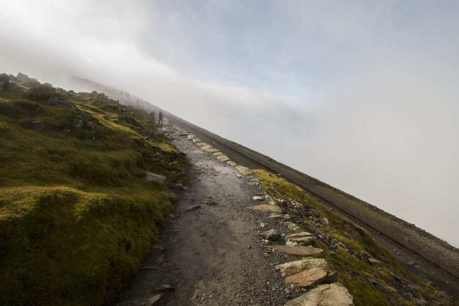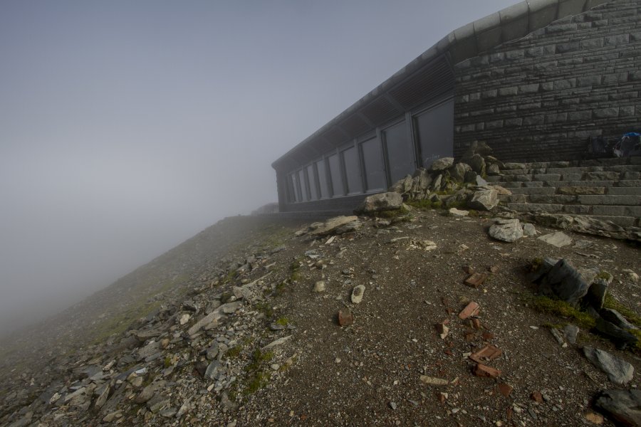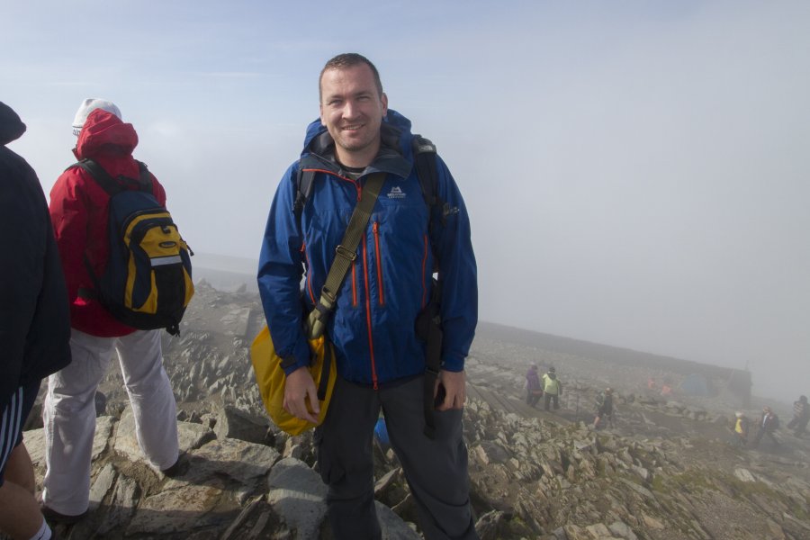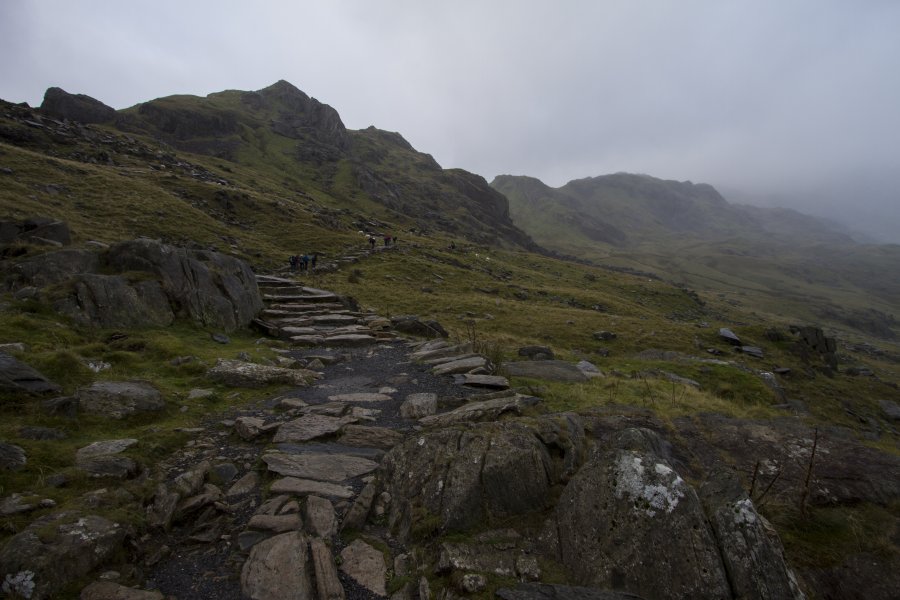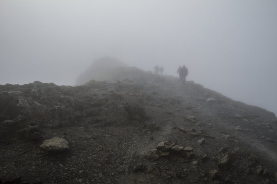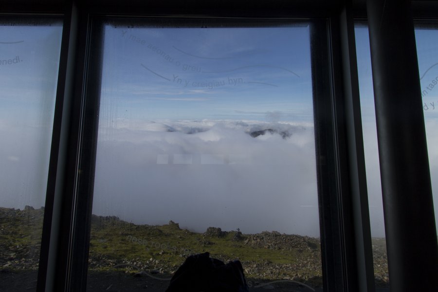 A crap night’s sleep in the tent and a few too many beers last night left me feeling cream crackered this morning. A coffee and a bacon roll at Pen-Y-Pass gave me some much needed energy for today’s clamber up Mount Snowdon. On the 3 other occasions that I have been up Snowdon I had started the walk at 2am so when we set off in dreary conditions this morning I felt accustomed to the poor visibility. I only managed to squeeze off a few photos on the way up due to how wet we were getting walking up through the cloud. We were impressed with Mark’s performance today. He looked tired when we arrived at the Snowdon Summit Café but we certainly didn’t feel like he had slowed us down. To our surprise the summit started to clear whilst we were in the café and we managed to get a few brief views of distance peaks breaking the cloud line.