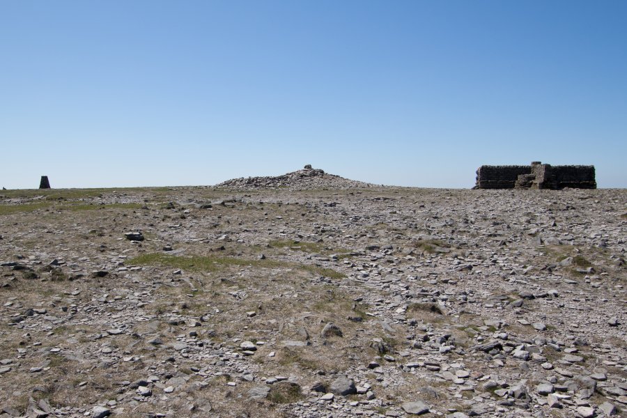 AN EARLY MORING ICE CREAM FROM A SNACK VAN NEAR RIBBLEHEAD VIADUCT PUT A SMILE ON ALAN'S FACE AND OUR WINDING CLIMB UP WHERNSIDE BEGAN. THE WIND BLOWING UP OVER THE EDGE AS WE APPROACHED THE SUMMIT WAS SURPRISINGLY STRONG SO WE TOOK THE SUMMIT PHOTO AND SHELTERED ON SEATING BEHIND THE WALL. 11.30AM, 1 MORE PEAK AHEAD OF US AND WE WE FEELING PRETTY GOOD.
